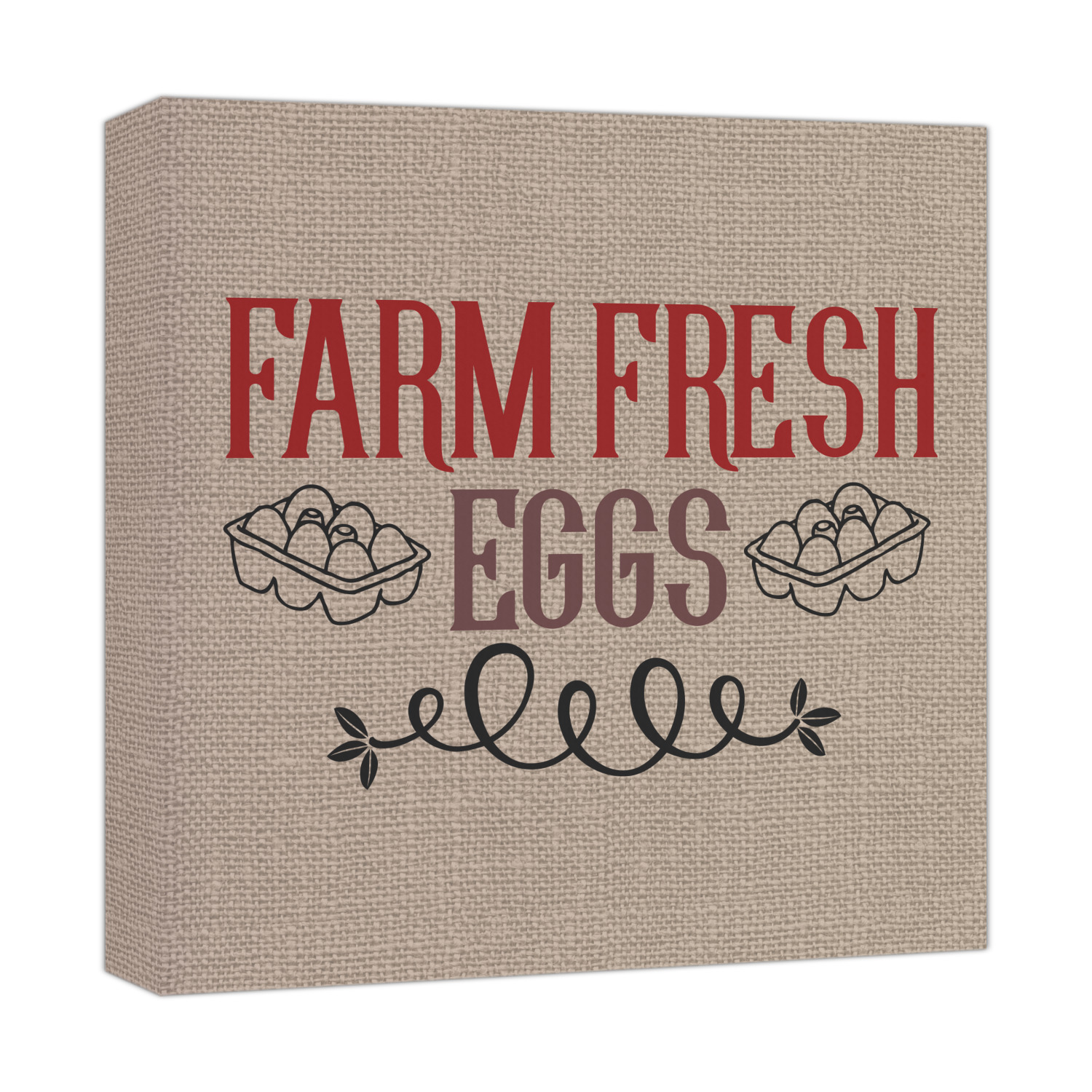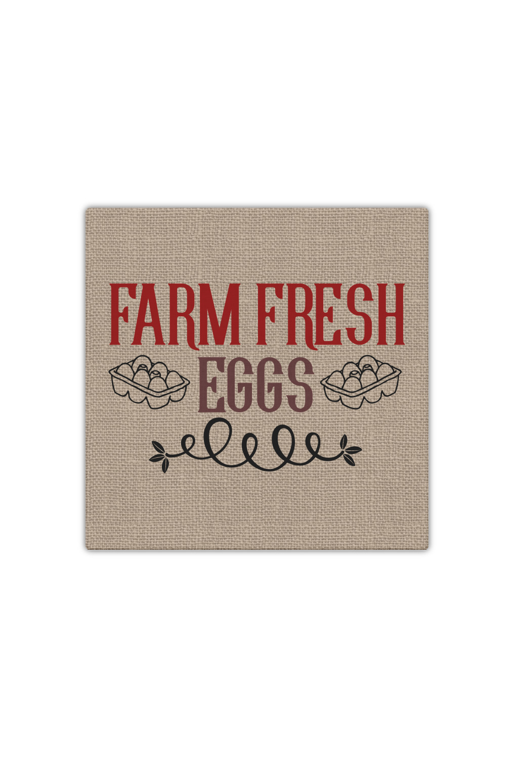 This design uses the quote "farm fresh eggs" with two crates of eggs pictured on either side and a beautiful scrolling design below. The quote has a bright and dark red, both which stand out beautifully against the burlap textured background. This quote and a chicken graphic are used throughout the design.