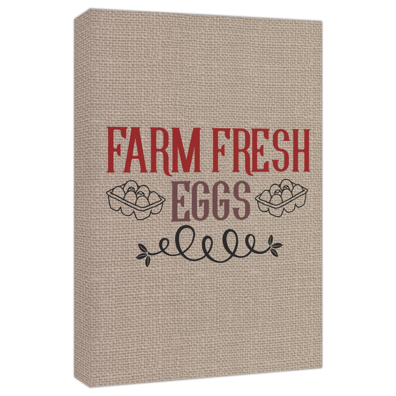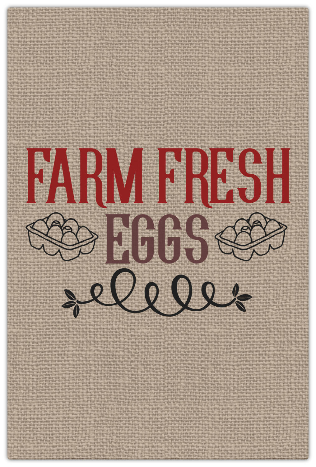 This design uses the quote "farm fresh eggs" with two crates of eggs pictured on either side and a beautiful scrolling design below. The quote has a bright and dark red, both which stand out beautifully against the burlap textured background. This quote and a chicken graphic are used throughout the design.