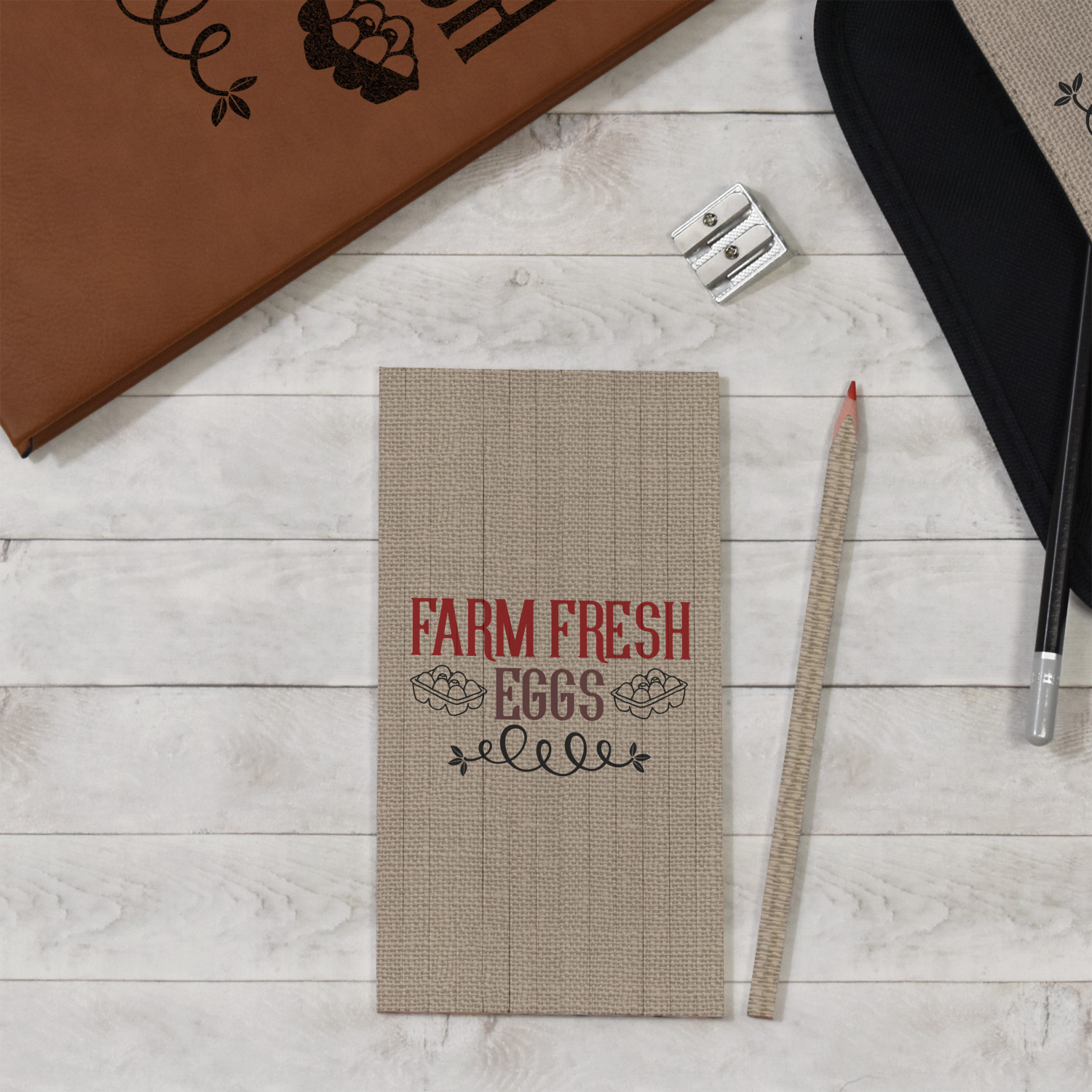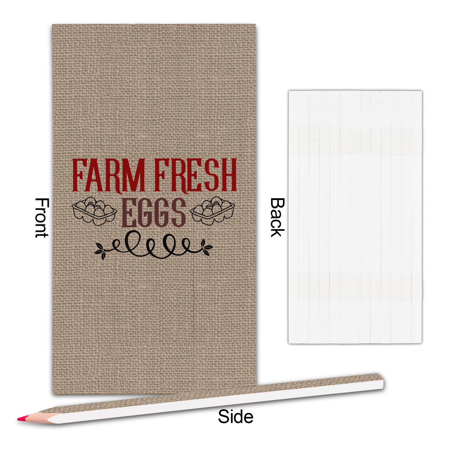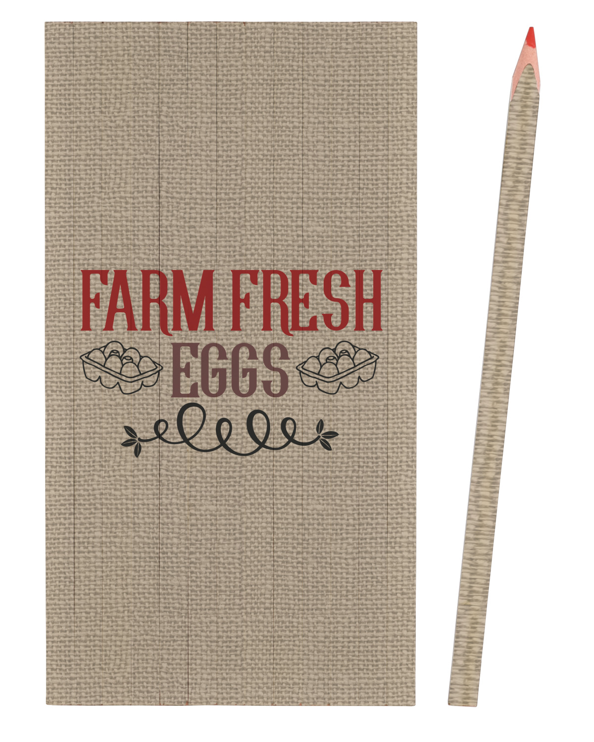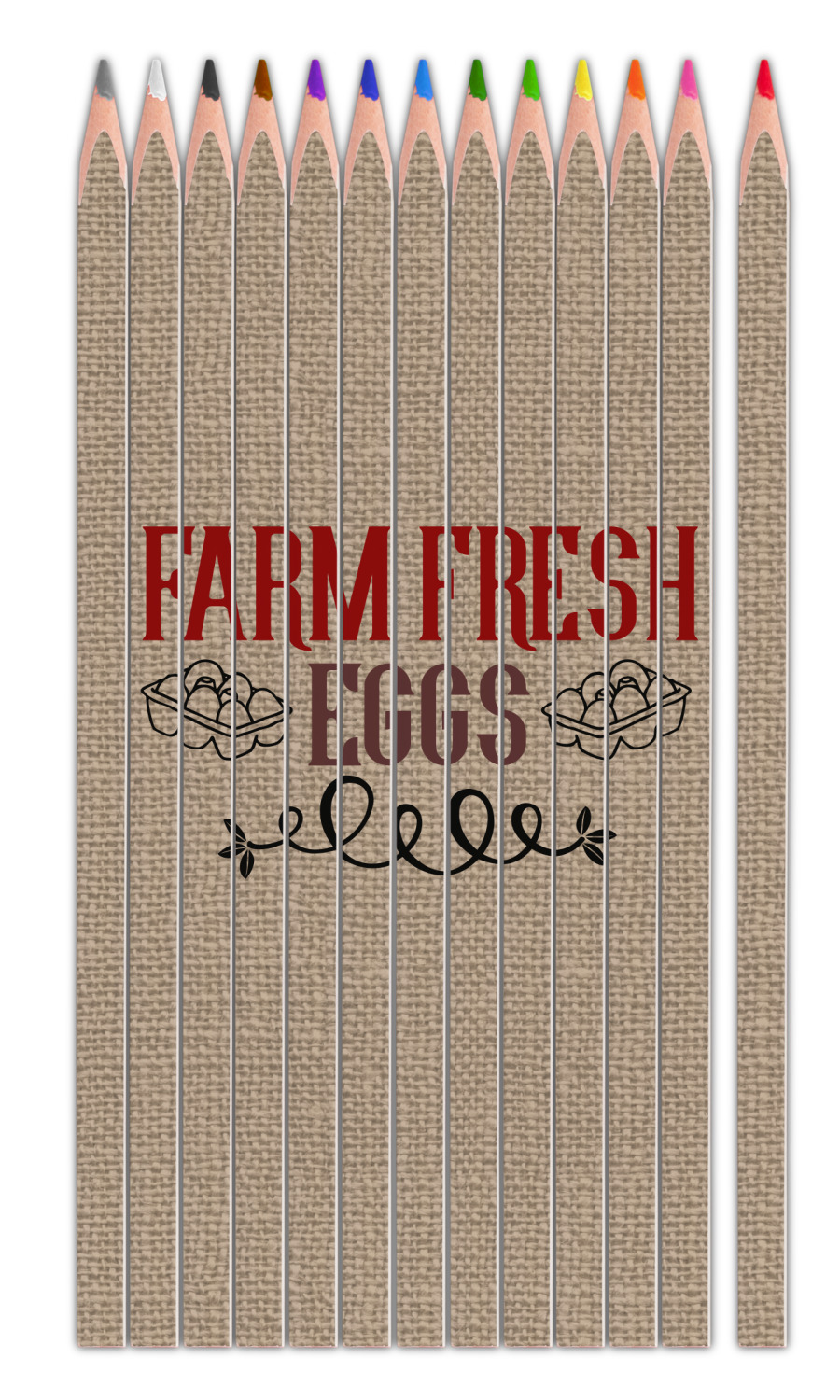 This design uses the quote "farm fresh eggs" with two crates of eggs pictured on either side and a beautiful scrolling design below. The quote has a bright and dark red, both which stand out beautifully against the burlap textured background. This quote and a chicken graphic are used throughout the design.
