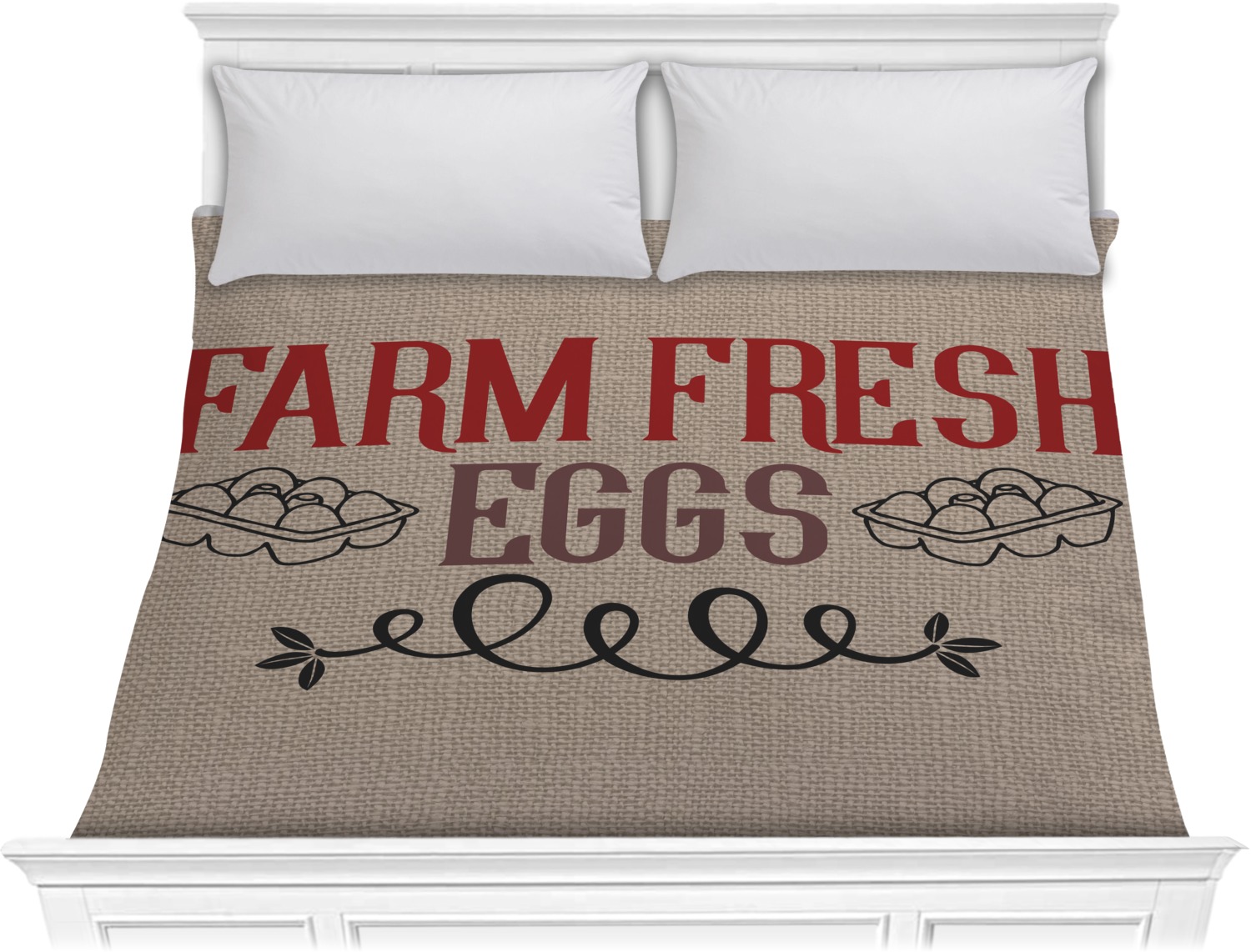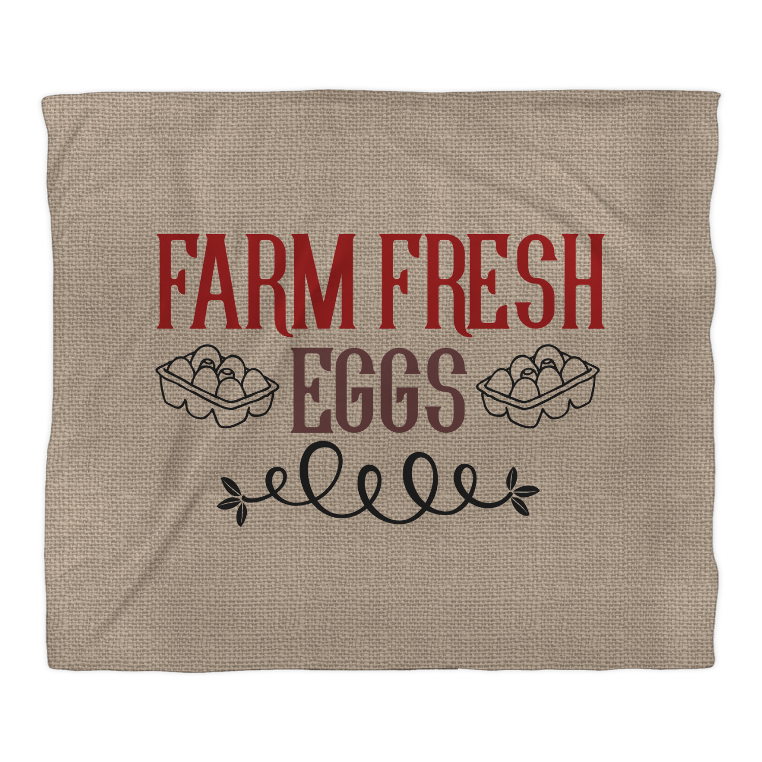 This design uses the quote "farm fresh eggs" with two crates of eggs pictured on either side and a beautiful scrolling design below. The quote has a bright and dark red, both which stand out beautifully against the burlap textured background. This quote and a chicken graphic are used throughout the design.