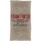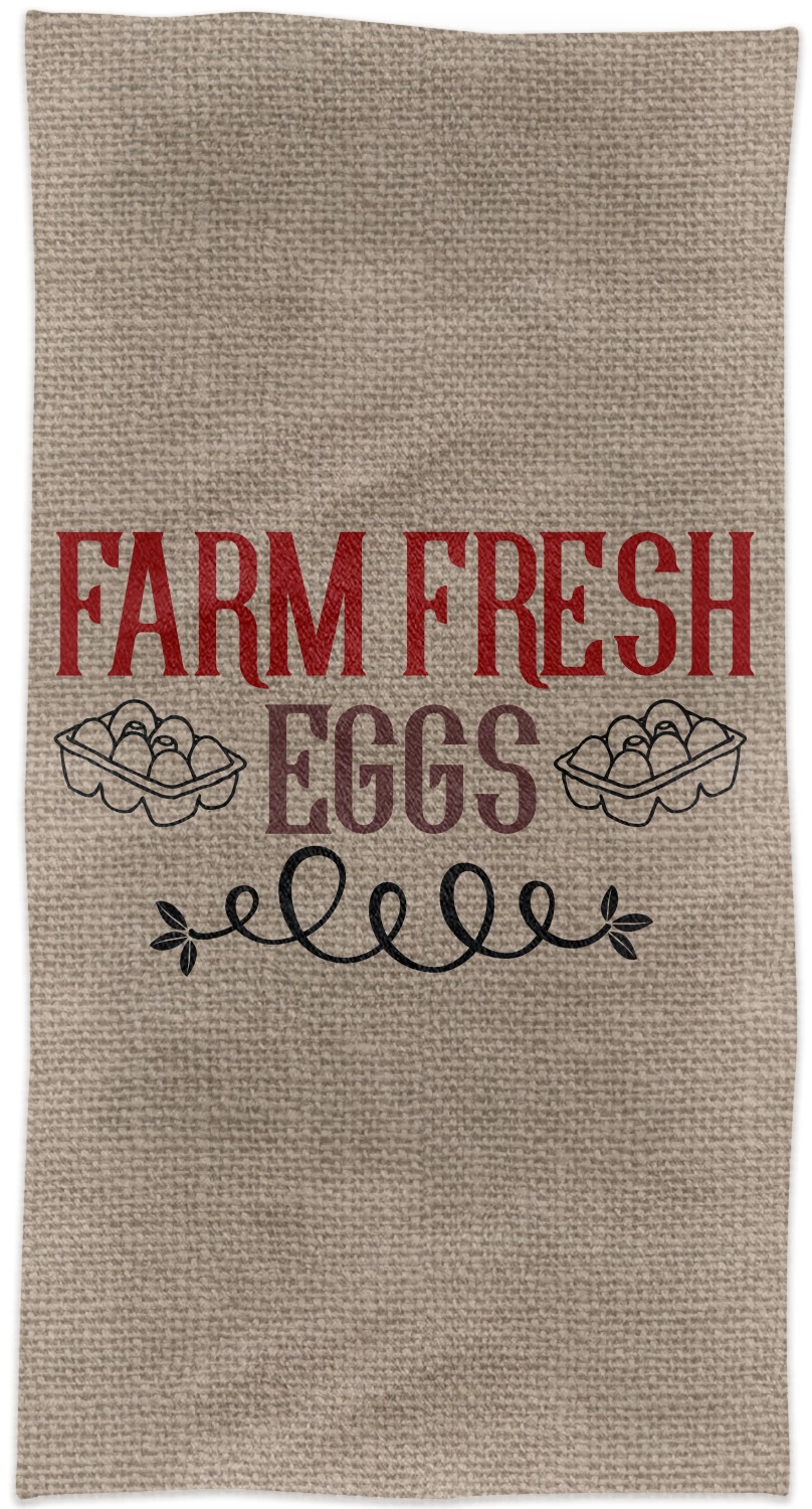 This design uses the quote "farm fresh eggs" with two crates of eggs pictured on either side and a beautiful scrolling design below. The quote has a bright and dark red, both which stand out beautifully against the burlap textured background. This quote and a chicken graphic are used throughout the design.
