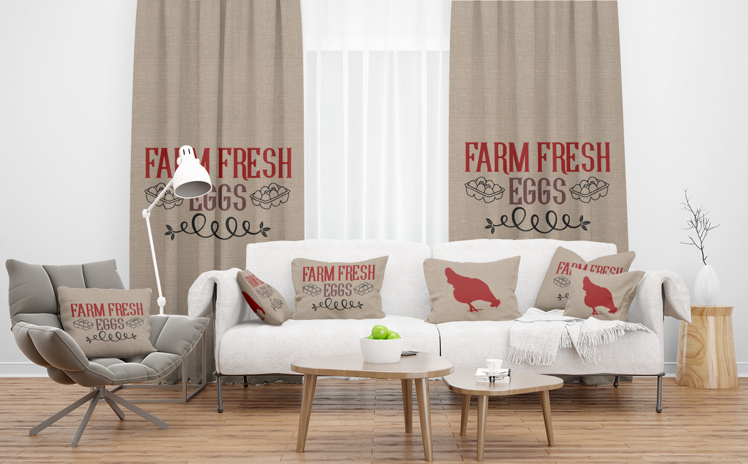 This design uses the quote "farm fresh eggs" with two crates of eggs pictured on either side and a beautiful scrolling design below. The quote has a bright and dark red, both which stand out beautifully against the burlap textured background. This quote and a chicken graphic are used throughout the design.