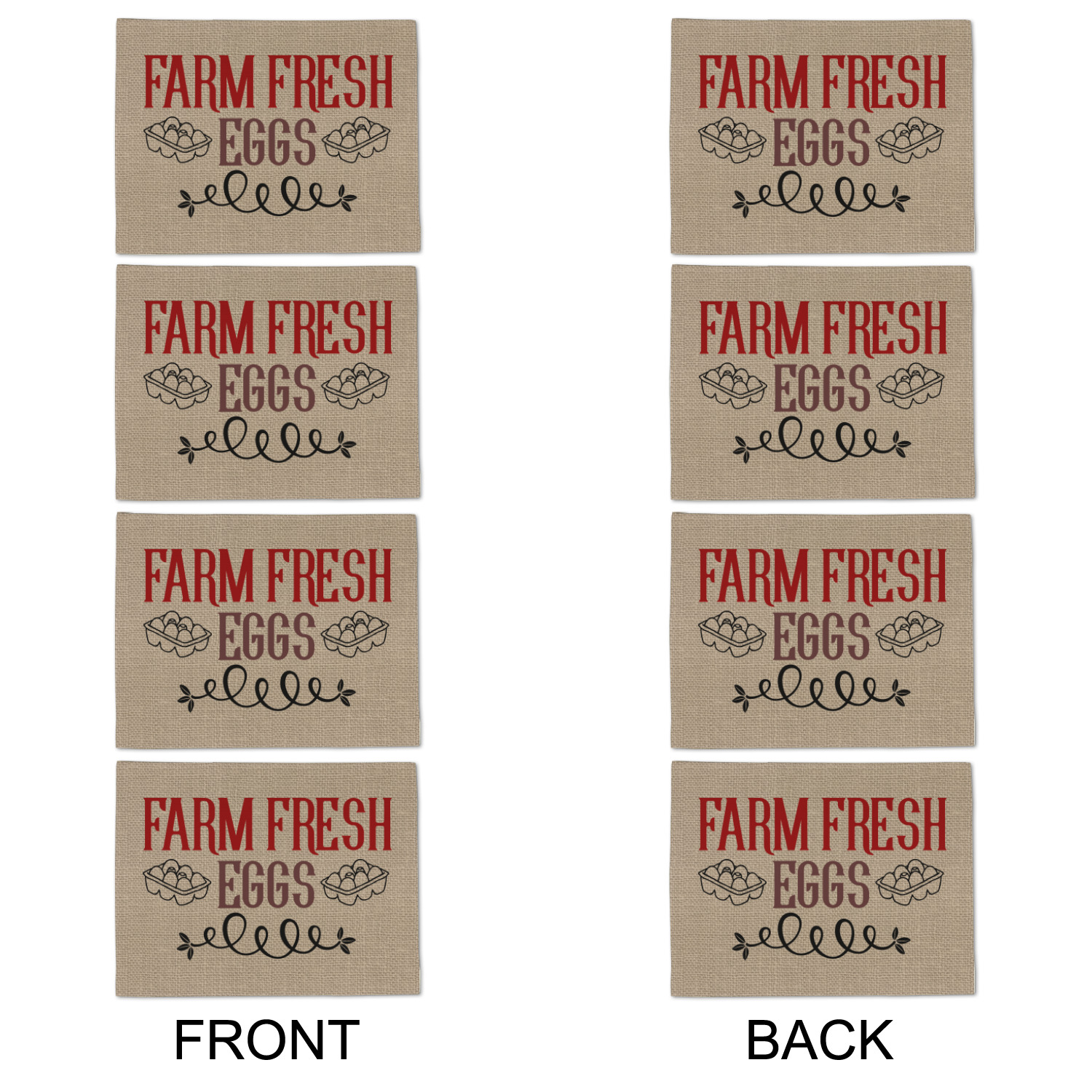 This design uses the quote "farm fresh eggs" with two crates of eggs pictured on either side and a beautiful scrolling design below. The quote has a bright and dark red, both which stand out beautifully against the burlap textured background. This quote and a chicken graphic are used throughout the design.