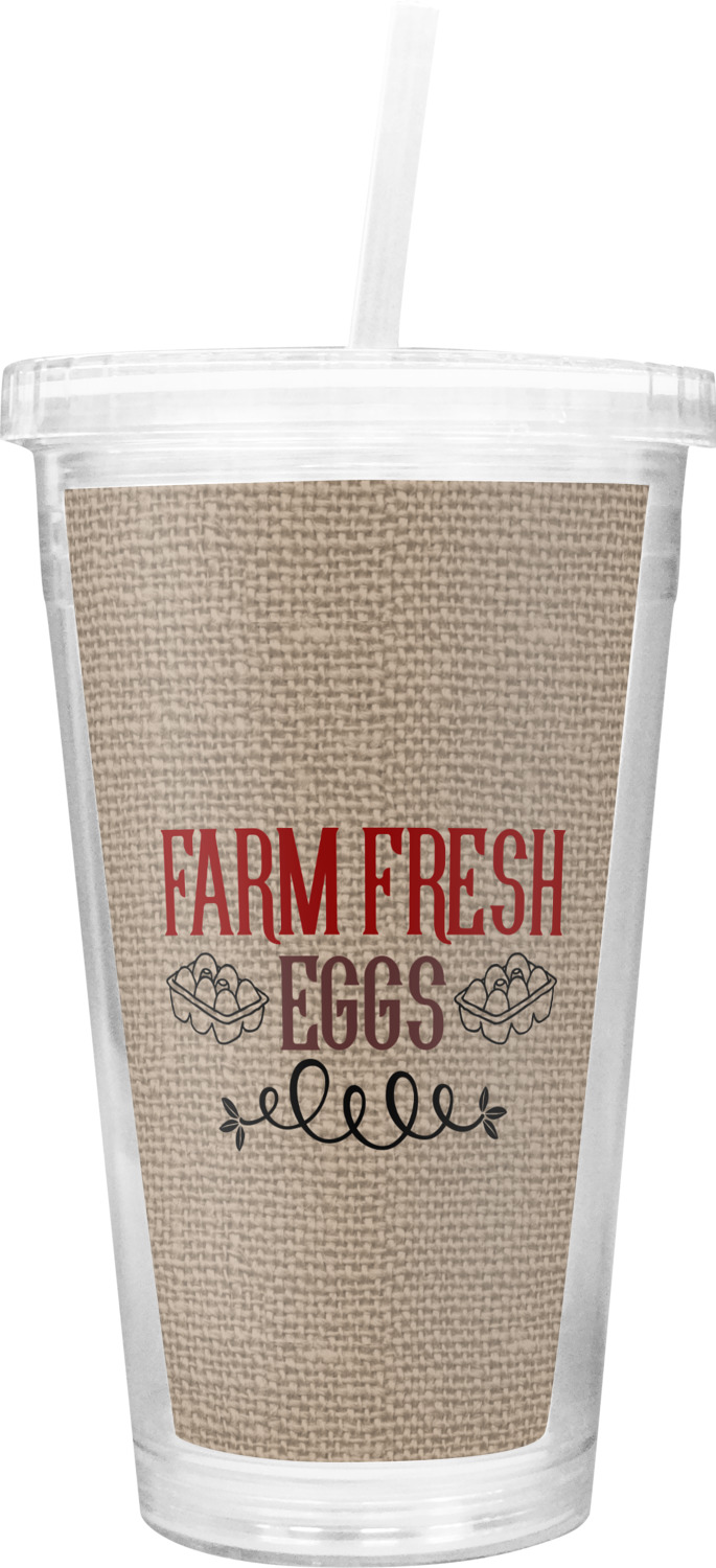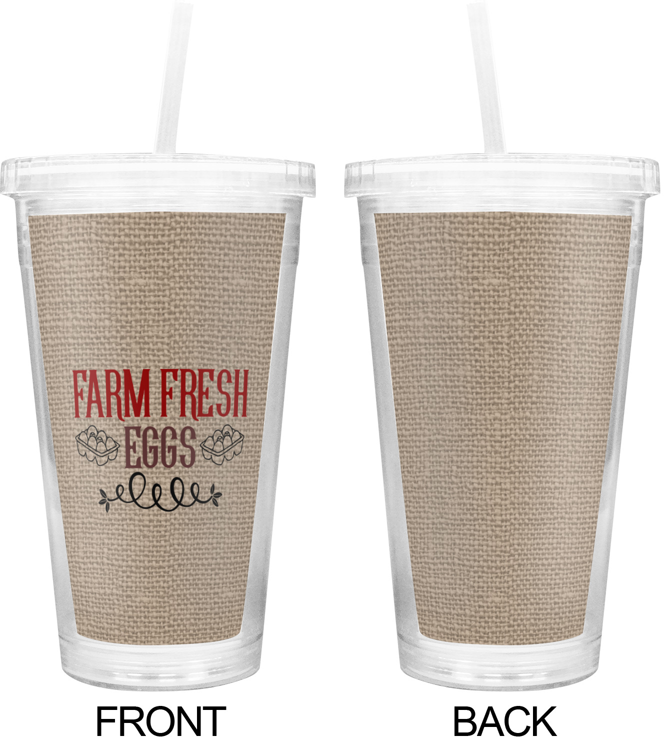 These BPA free tumblers with their double walls keep your drink cold and will not sweat on the outside; they have a clear acrylic top and a reusable straw with a ring around the bottom to keep the straw from falling out.