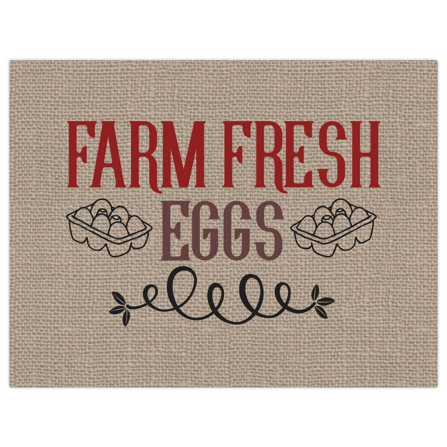 This design uses the quote "farm fresh eggs" with two crates of eggs pictured on either side and a beautiful scrolling design below. The quote has a bright and dark red, both which stand out beautifully against the burlap textured background. This quote and a chicken graphic are used throughout the design.