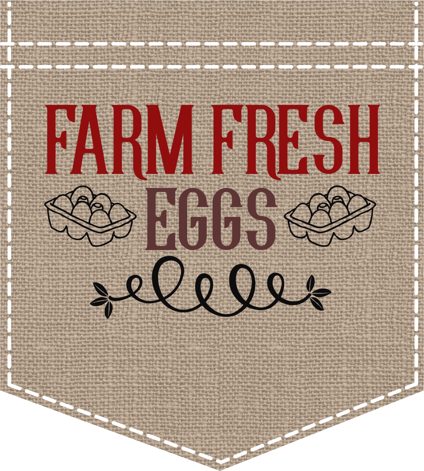 This design uses the quote "farm fresh eggs" with two crates of eggs pictured on either side and a beautiful scrolling design below. The quote has a bright and dark red, both which stand out beautifully against the burlap textured background. This quote and a chicken graphic are used throughout the design.