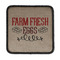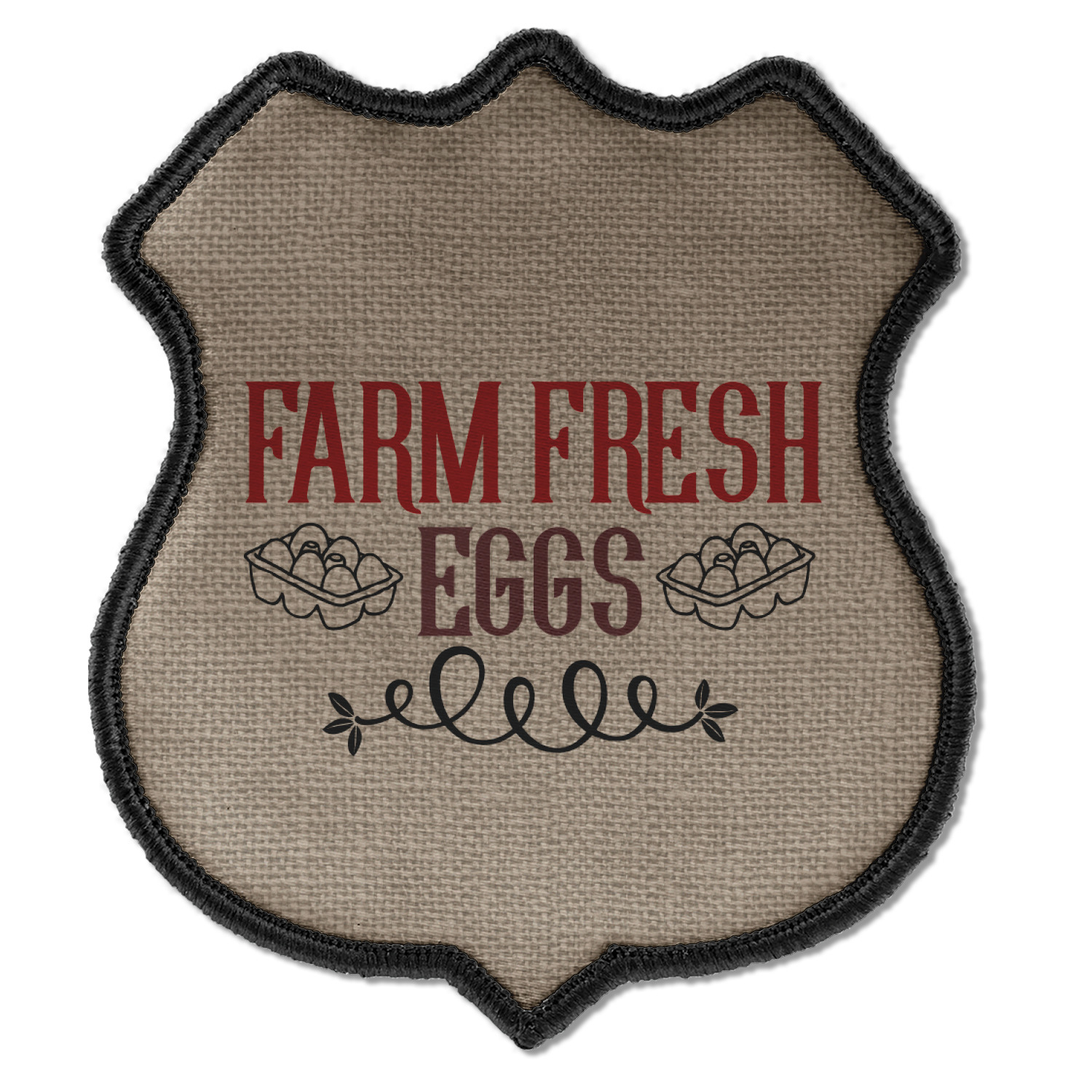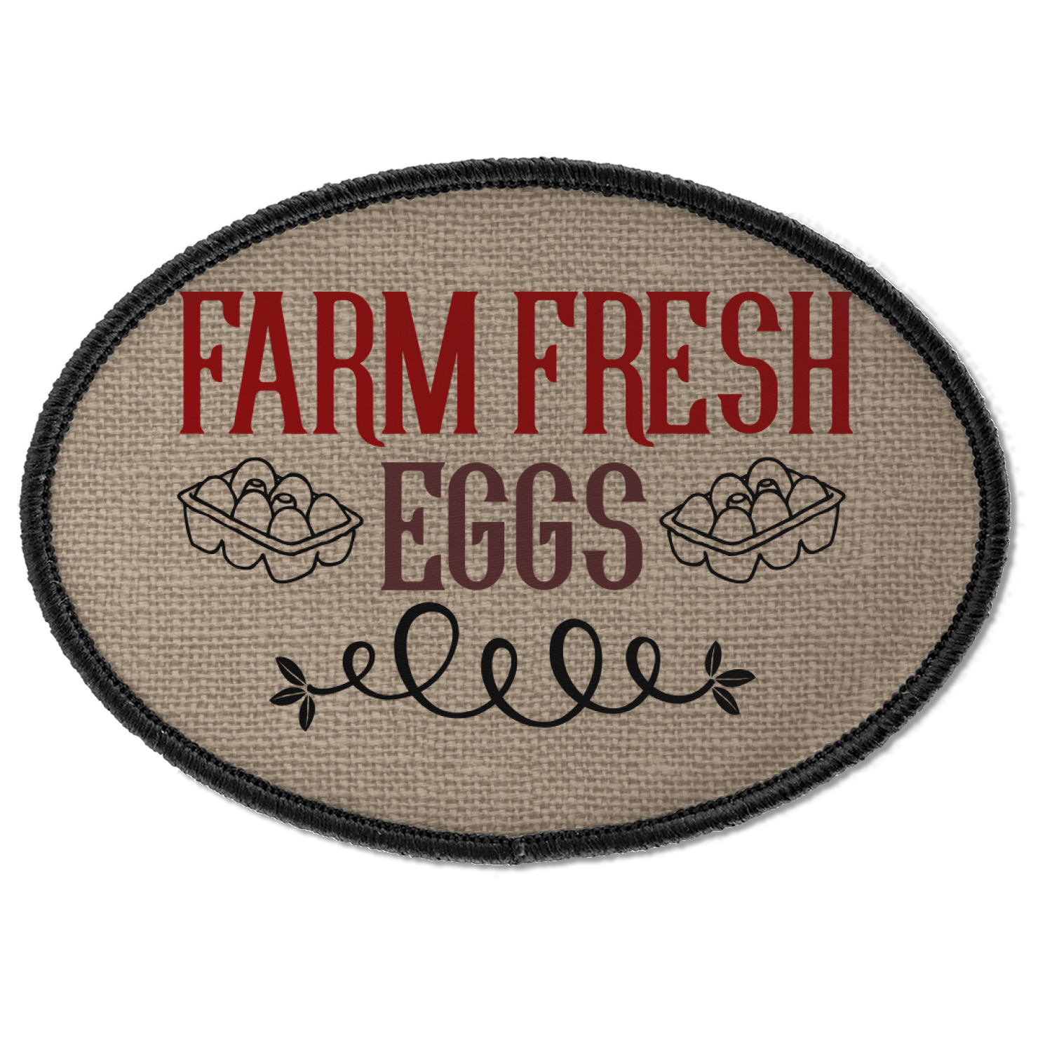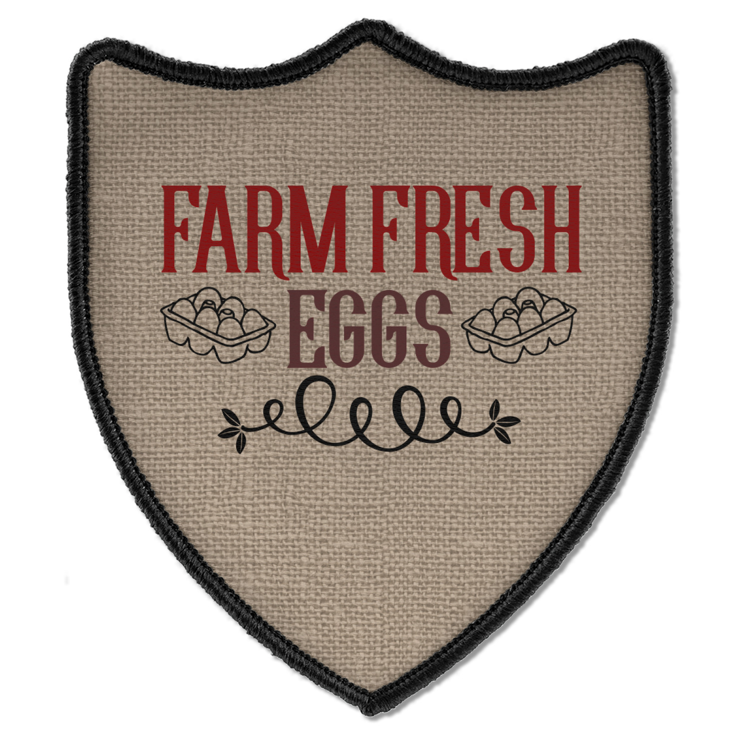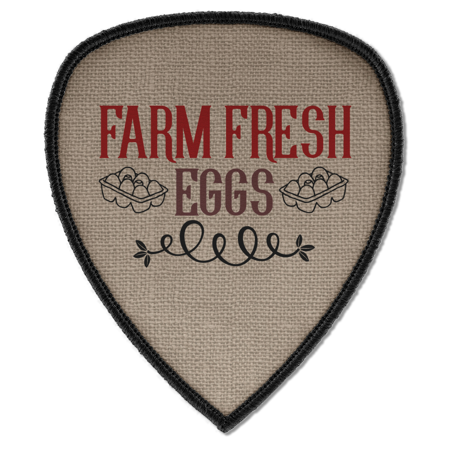 This design uses the quote "farm fresh eggs" with two crates of eggs pictured on either side and a beautiful scrolling design below. The quote has a bright and dark red, both which stand out beautifully against the burlap textured background. This quote and a chicken graphic are used throughout the design.