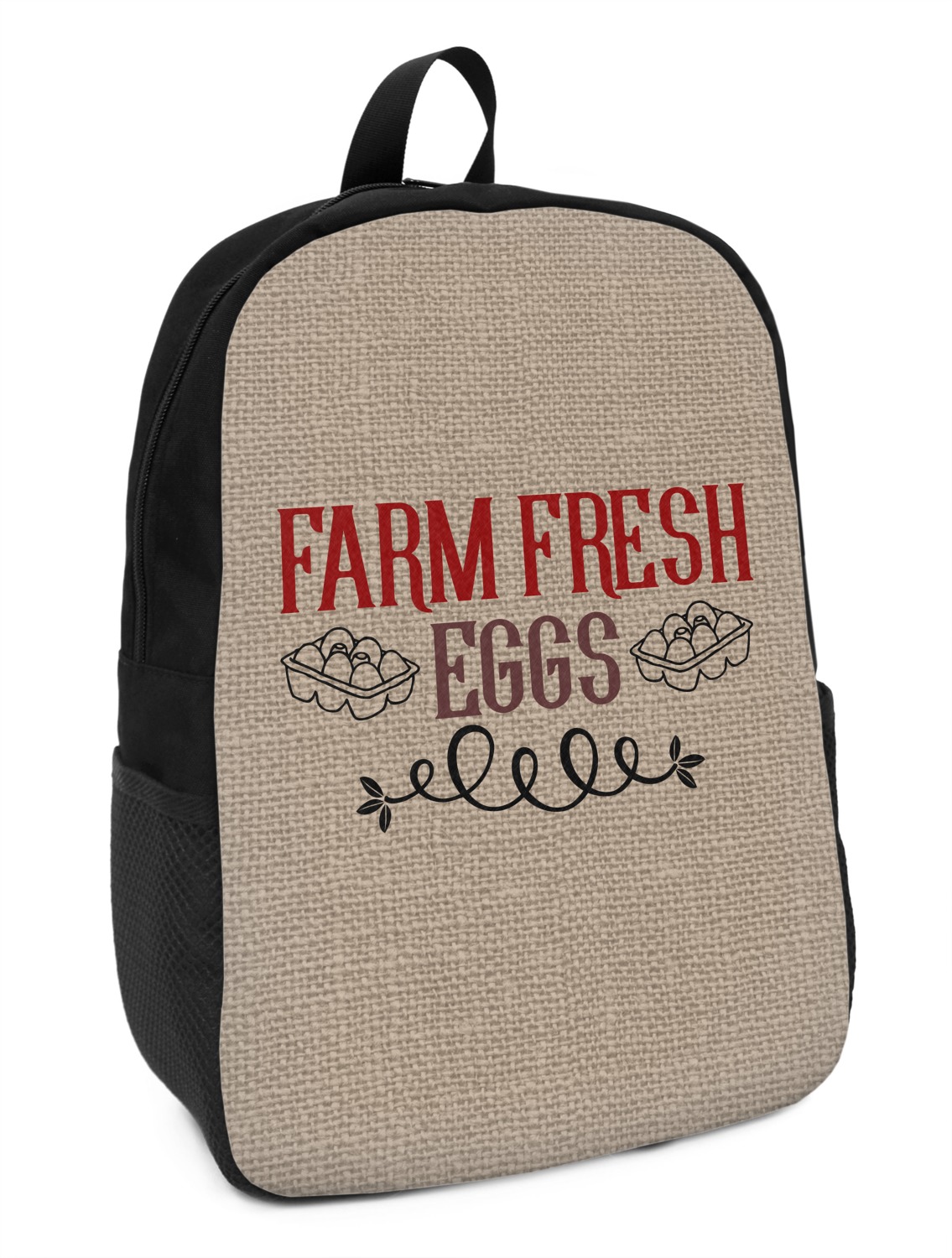 This design uses the quote "farm fresh eggs" with two crates of eggs pictured on either side and a beautiful scrolling design below. The quote has a bright and dark red, both which stand out beautifully against the burlap textured background. This quote and a chicken graphic are used throughout the design.