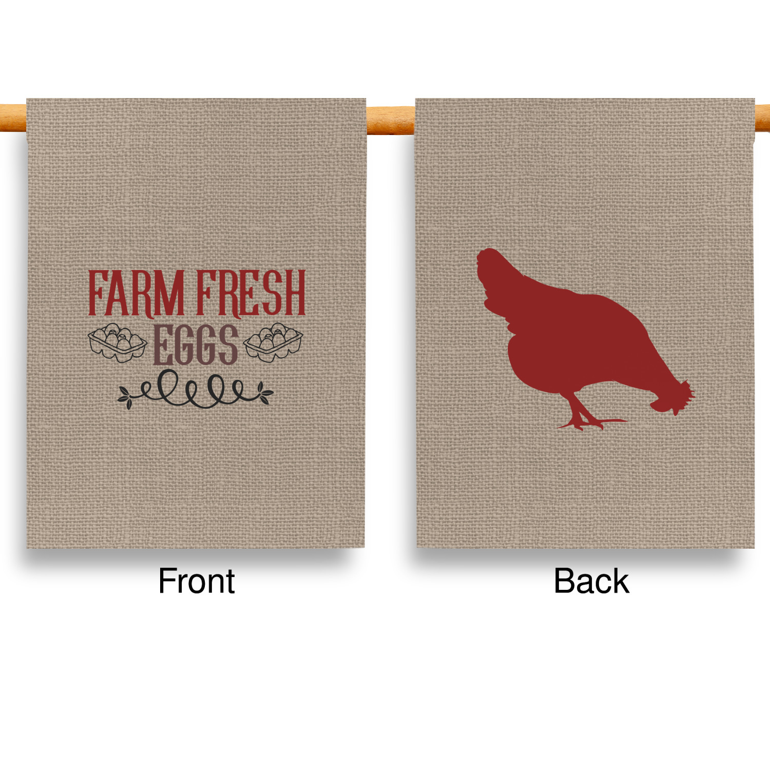 This design uses the quote "farm fresh eggs" with two crates of eggs pictured on either side and a beautiful scrolling design below. The quote has a bright and dark red, both which stand out beautifully against the burlap textured background. This quote and a chicken graphic are used throughout the design.