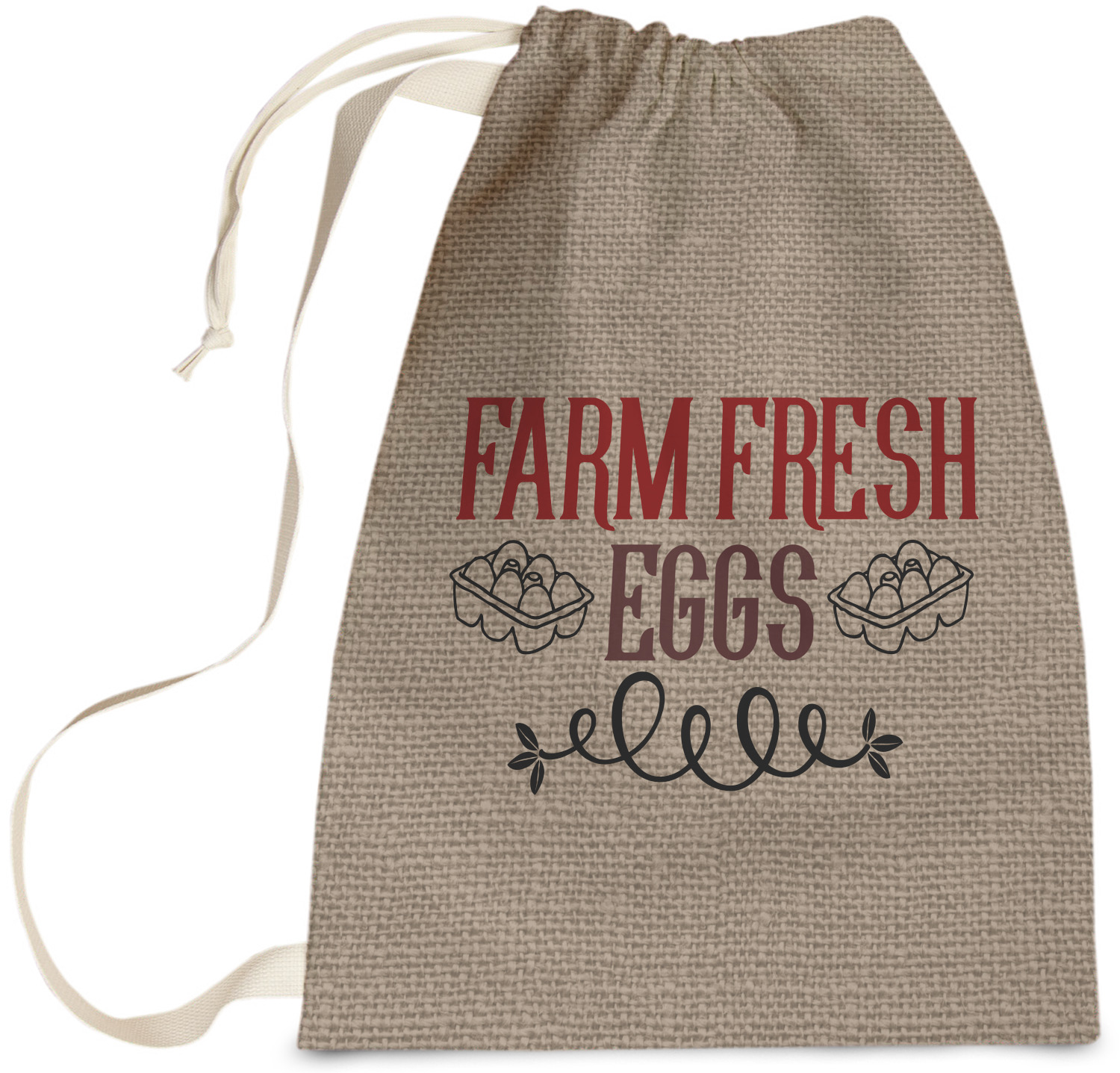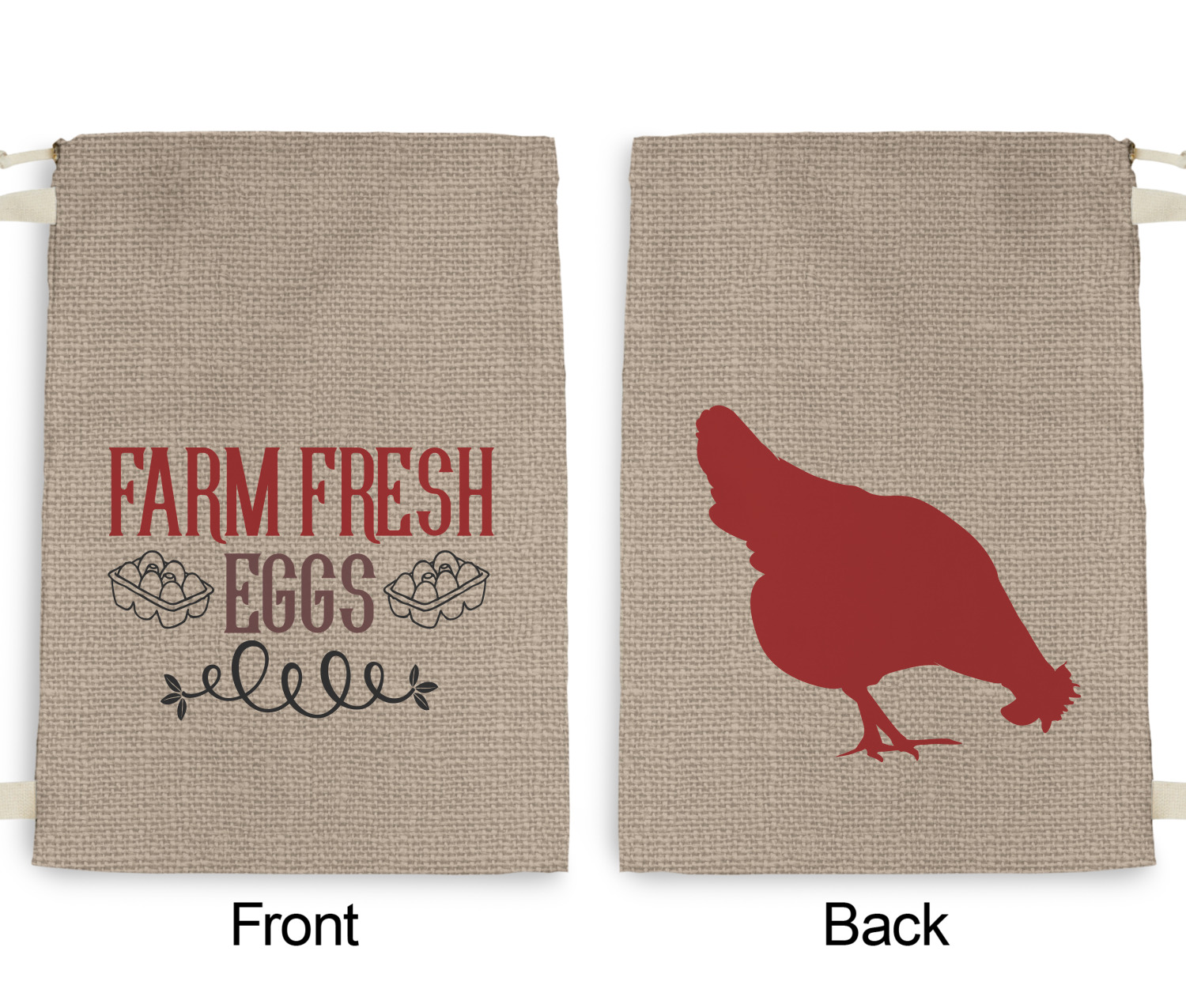 This design uses the quote "farm fresh eggs" with two crates of eggs pictured on either side and a beautiful scrolling design below. The quote has a bright and dark red, both which stand out beautifully against the burlap textured background. This quote and a chicken graphic are used throughout the design.