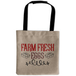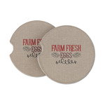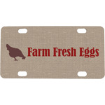 This design uses the quote "farm fresh eggs" with two crates of eggs pictured on either side and a beautiful scrolling design below. The quote has a bright and dark red, both which stand out beautifully against the burlap textured background. This quote and a chicken graphic are used throughout the design.