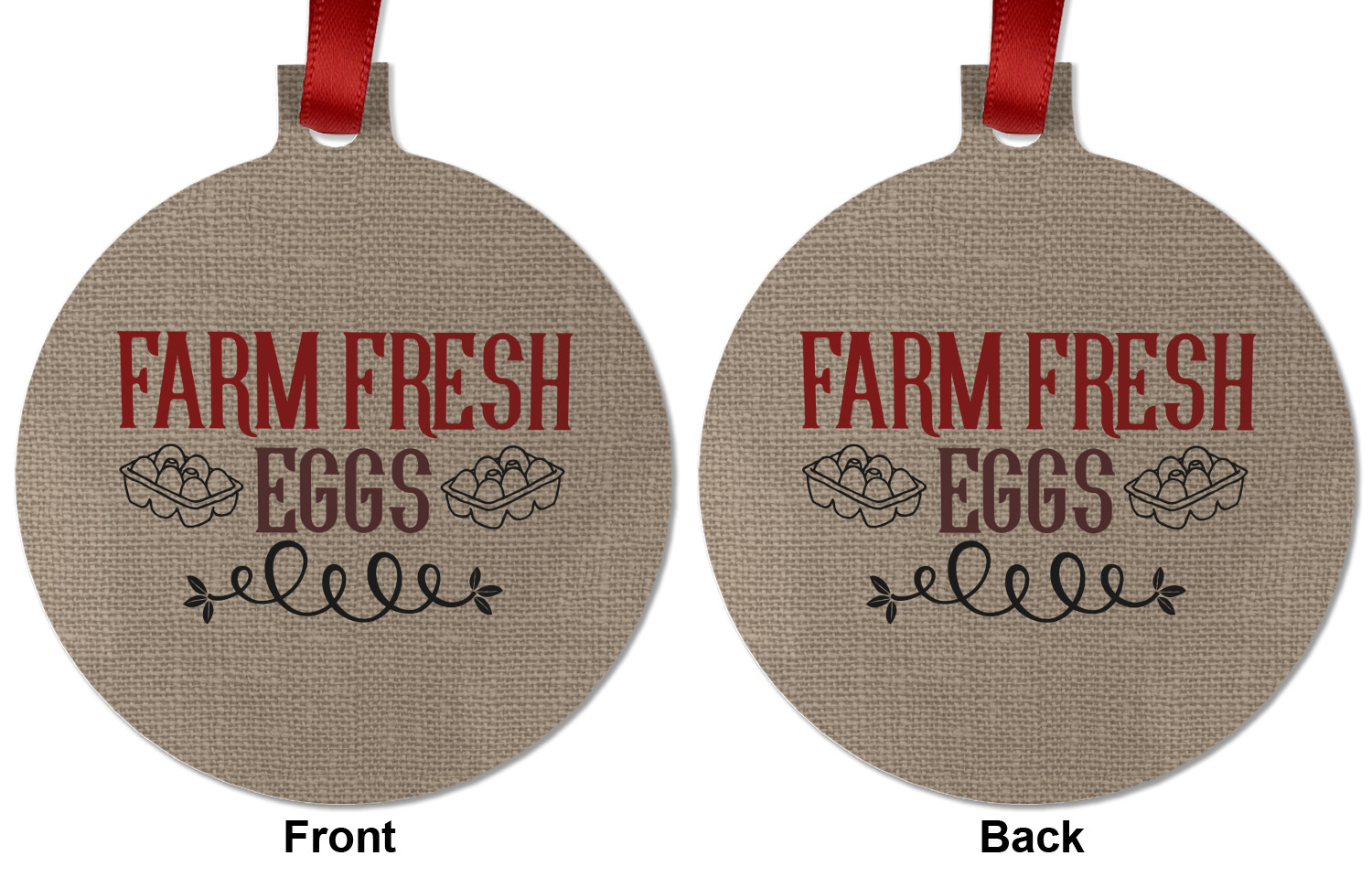This design uses the quote "farm fresh eggs" with two crates of eggs pictured on either side and a beautiful scrolling design below. The quote has a bright and dark red, both which stand out beautifully against the burlap textured background. This quote and a chicken graphic are used throughout the design.