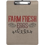 This design uses the quote "farm fresh eggs" with two crates of eggs pictured on either side and a beautiful scrolling design below. The quote has a bright and dark red, both which stand out beautifully against the burlap textured background. This quote and a chicken graphic are used throughout the design.