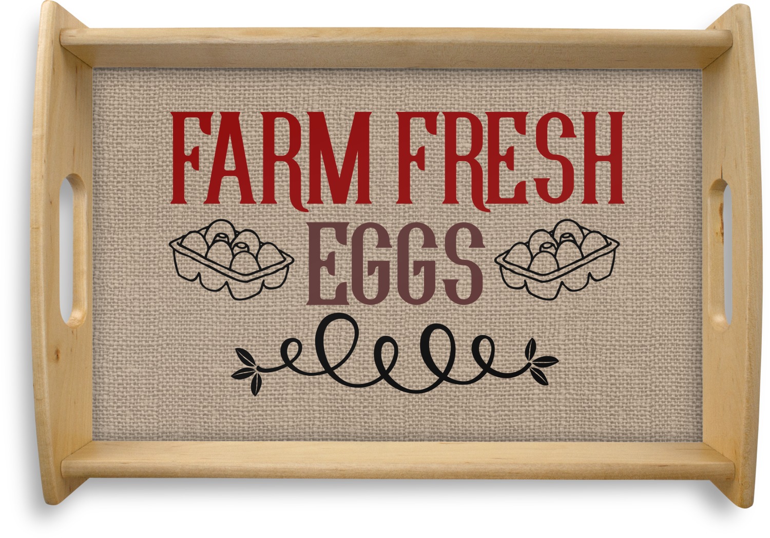 This serving tray with handles features square edges and two rounded sides, creating a very modern look. Each side is fabricated from a beautifully cut, natural wood. The bottom of the interior of the tray displays your customized design in bright, vibrant color. The tray is sold in both a black color and a natural wood look. Each variation of the wood serving tray has two sizes: Small, which is 14" x 10" x 2.25", and Large, which is 19.5" x 13.5" x 2.75".