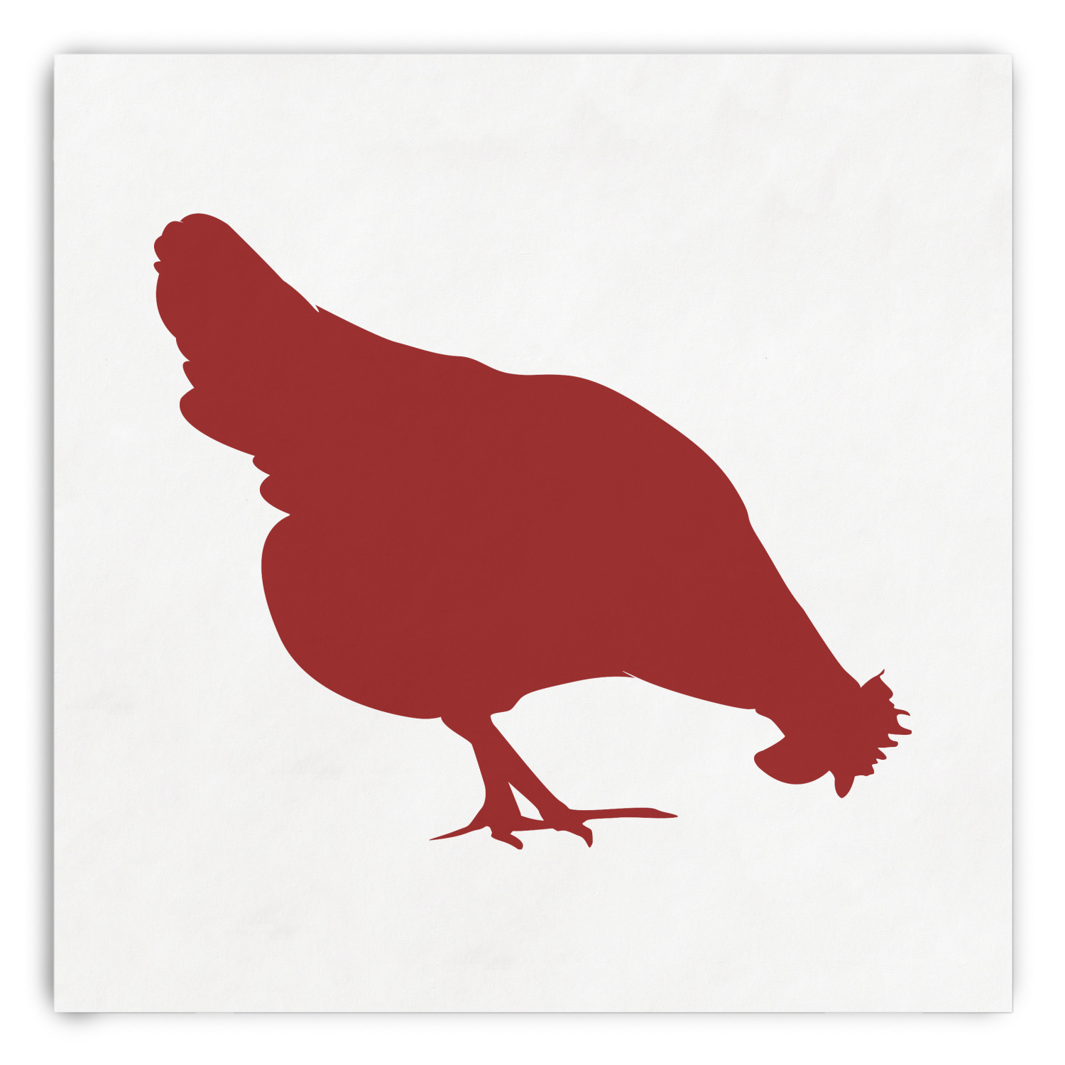 This design uses the quote "farm fresh eggs" with two crates of eggs pictured on either side and a beautiful scrolling design below. The quote has a bright and dark red, both which stand out beautifully against the burlap textured background. This quote and a chicken graphic are used throughout the design.