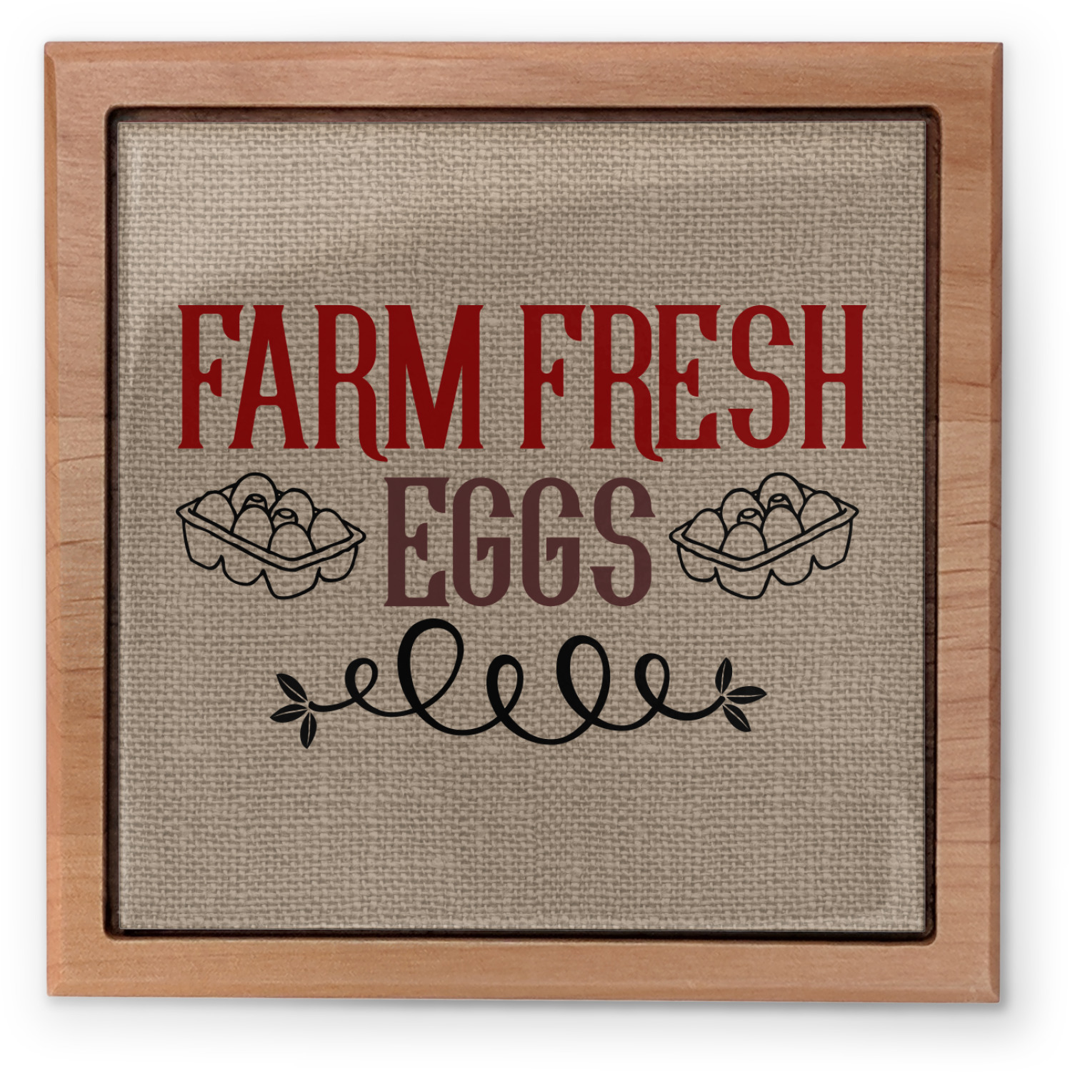 This design uses the quote "farm fresh eggs" with two crates of eggs pictured on either side and a beautiful scrolling design below. The quote has a bright and dark red, both which stand out beautifully against the burlap textured background. This quote and a chicken graphic are used throughout the design.
