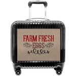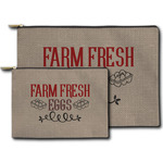 This design uses the quote "farm fresh eggs" with two crates of eggs pictured on either side and a beautiful scrolling design below. The quote has a bright and dark red, both which stand out beautifully against the burlap textured background. This quote and a chicken graphic are used throughout the design.
