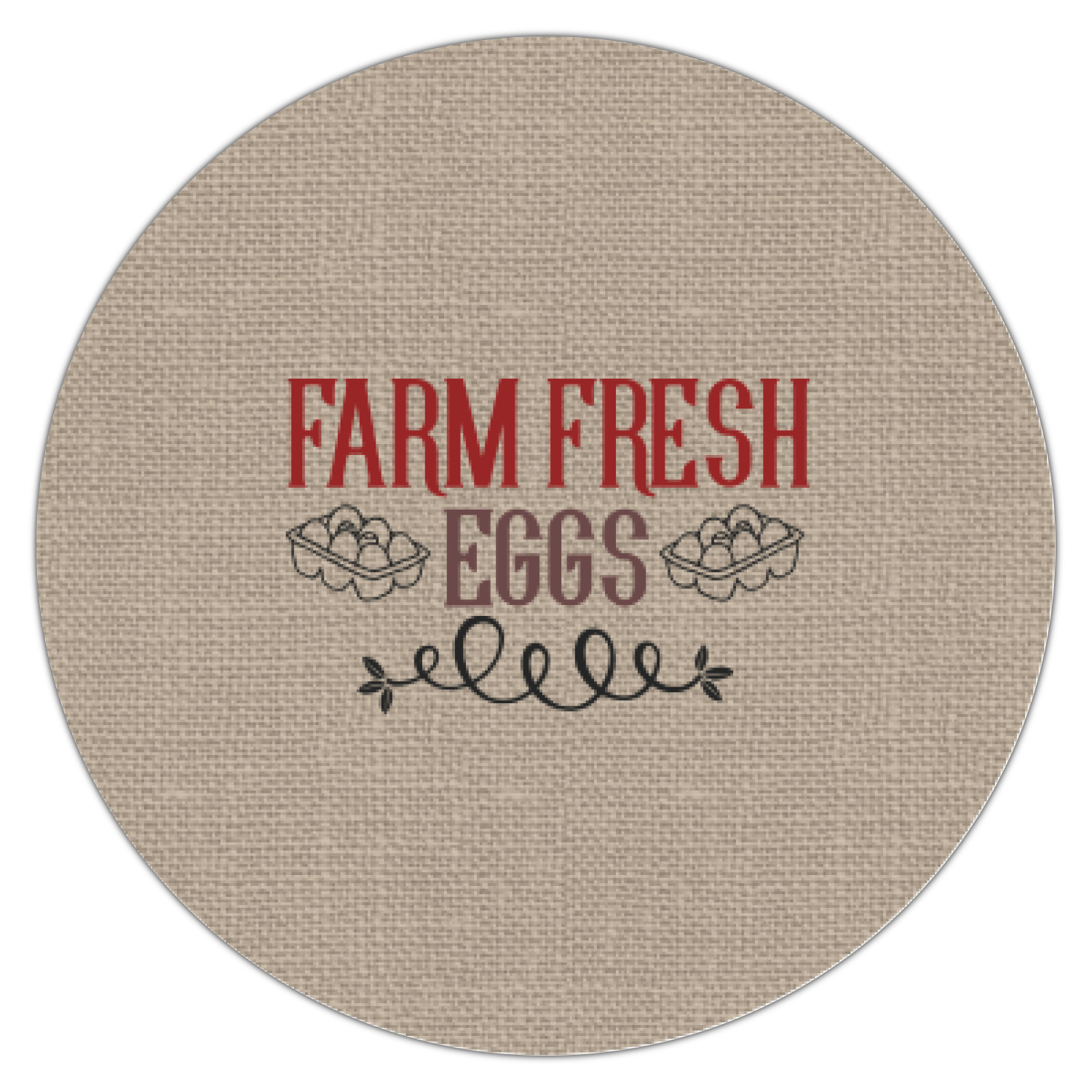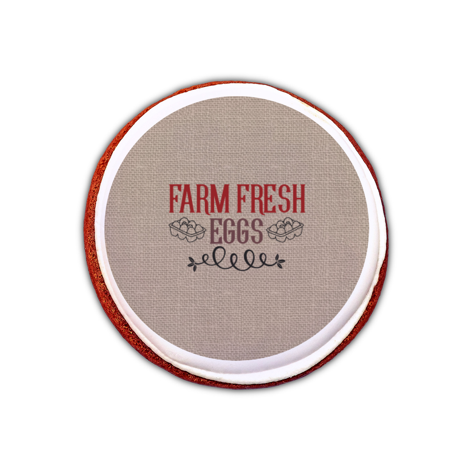 This design uses the quote "farm fresh eggs" with two crates of eggs pictured on either side and a beautiful scrolling design below. The quote has a bright and dark red, both which stand out beautifully against the burlap textured background. This quote and a chicken graphic are used throughout the design.