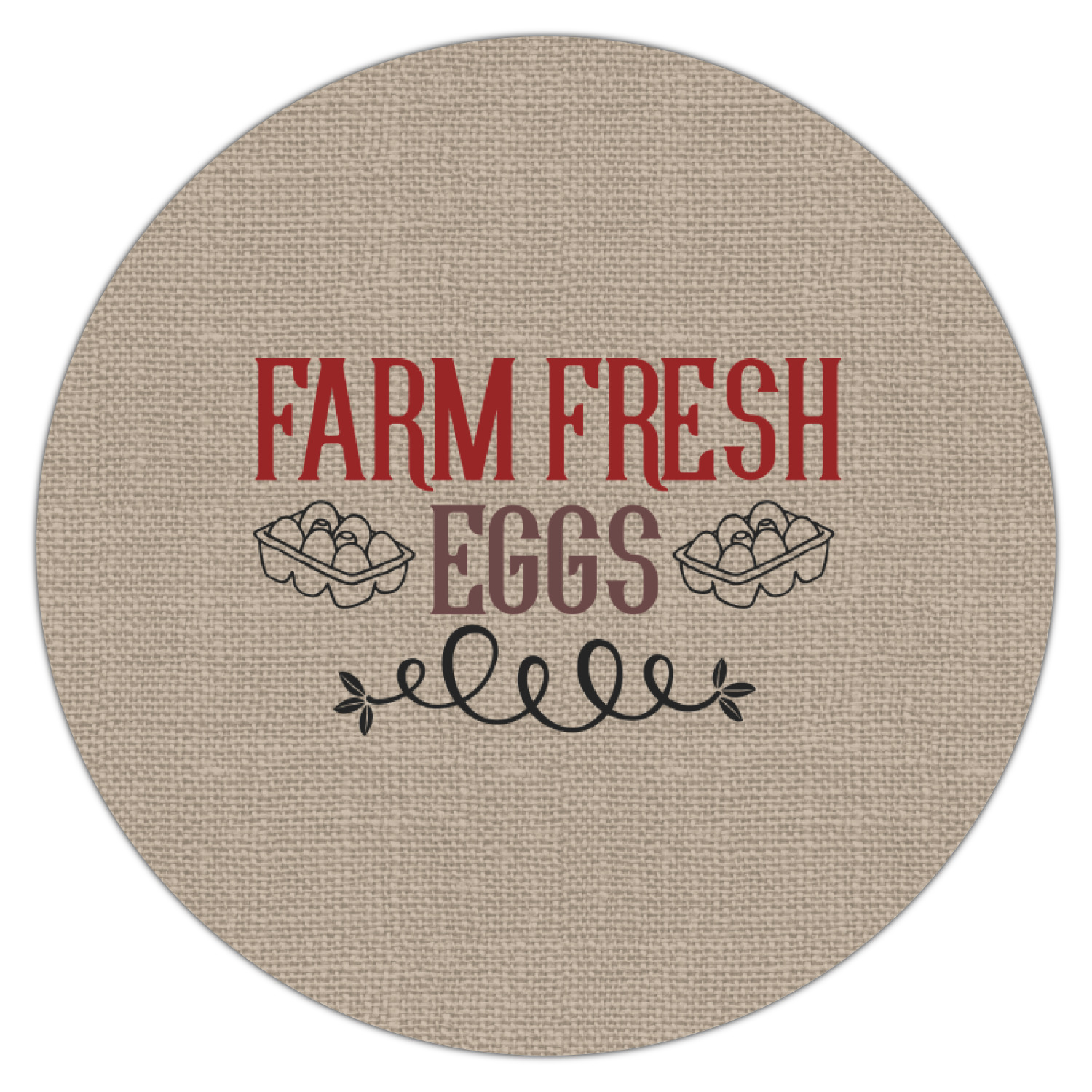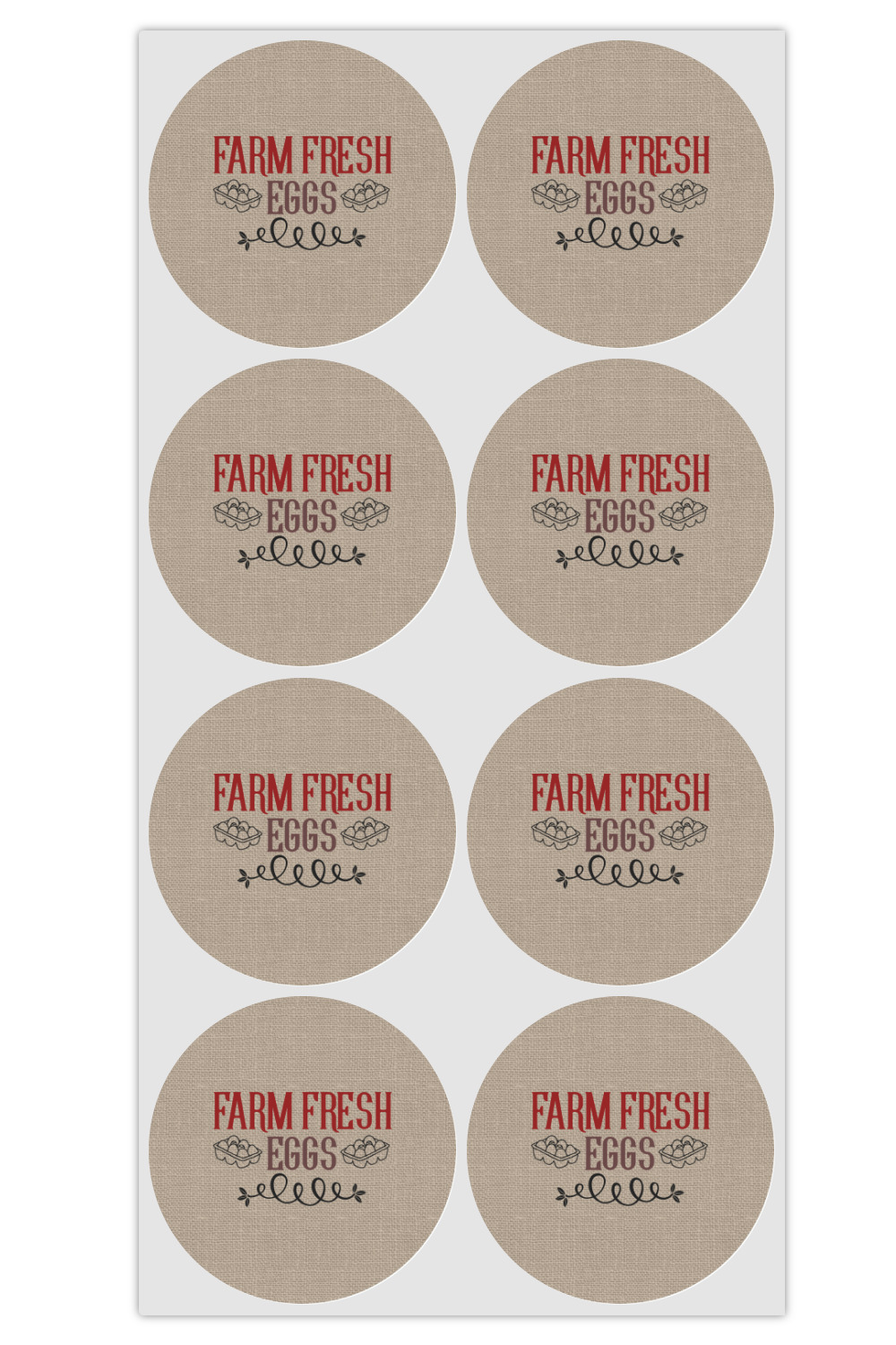 This design uses the quote "farm fresh eggs" with two crates of eggs pictured on either side and a beautiful scrolling design below. The quote has a bright and dark red, both which stand out beautifully against the burlap textured background. This quote and a chicken graphic are used throughout the design.
