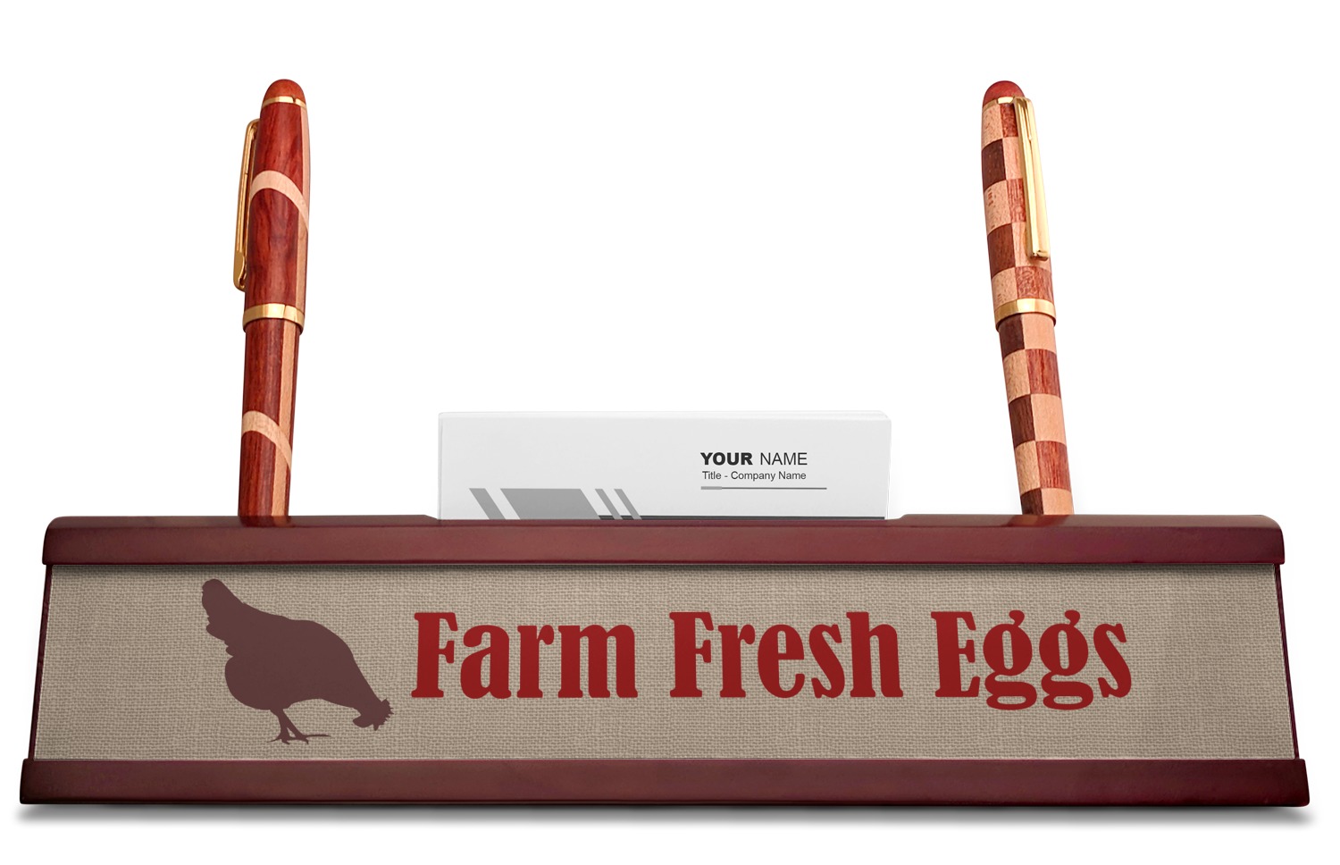 Your desk name plates are crafted from a high-quality, dark-cherry mahogany. At approximately 9.5 by 1.875 by 2.5 inches, this name plaque will fit perfectly, front and center, on your desk. Your customization spans across the entire face of the nameplate. Behind the nameplate lies a skinny slot that can fit approximately 15, traditionally-sized, business cards. You can also store your writing utensils on either side of this custom desk name plate.
