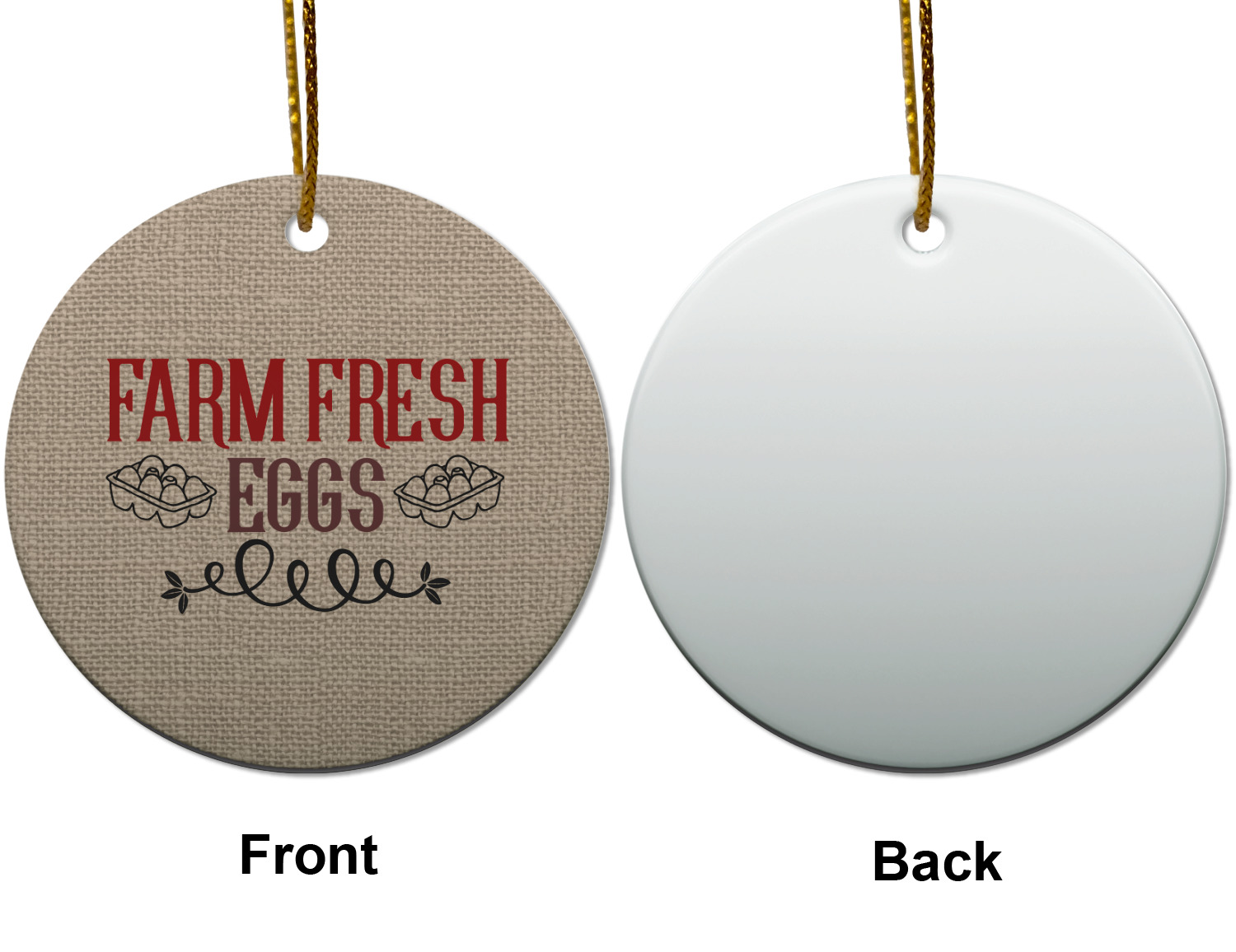 This design uses the quote "farm fresh eggs" with two crates of eggs pictured on either side and a beautiful scrolling design below. The quote has a bright and dark red, both which stand out beautifully against the burlap textured background. This quote and a chicken graphic are used throughout the design.