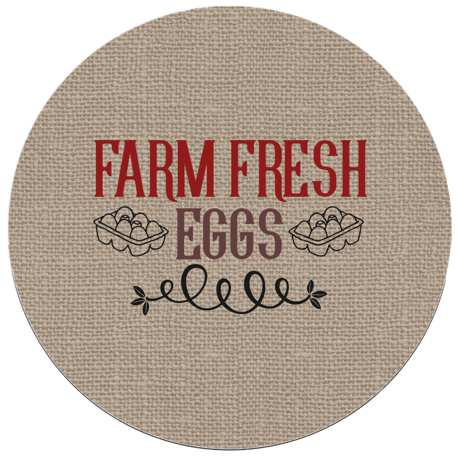 This design uses the quote "farm fresh eggs" with two crates of eggs pictured on either side and a beautiful scrolling design below. The quote has a bright and dark red, both which stand out beautifully against the burlap textured background. This quote and a chicken graphic are used throughout the design.