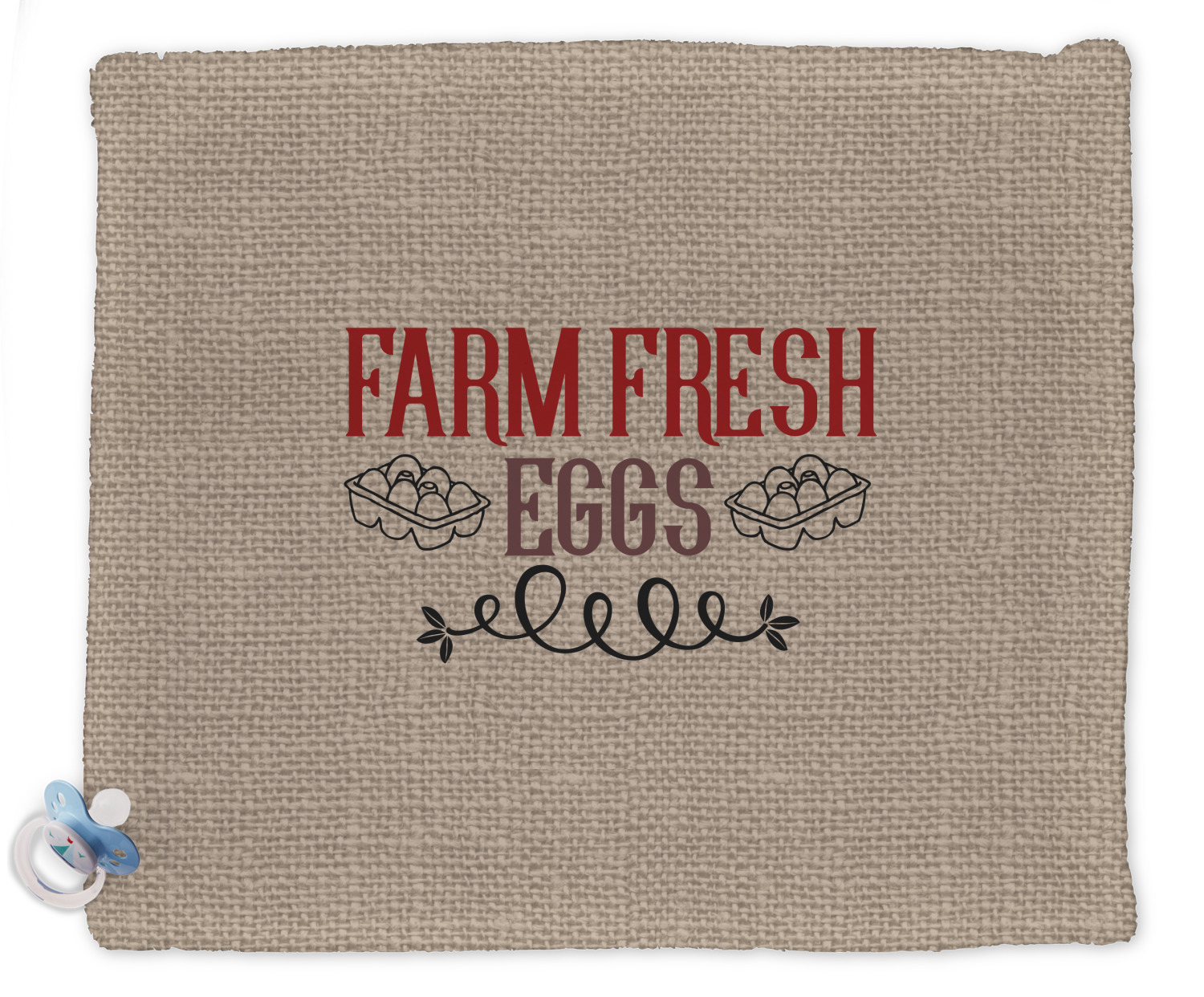 This design uses the quote "farm fresh eggs" with two crates of eggs pictured on either side and a beautiful scrolling design below. The quote has a bright and dark red, both which stand out beautifully against the burlap textured background. This quote and a chicken graphic are used throughout the design.