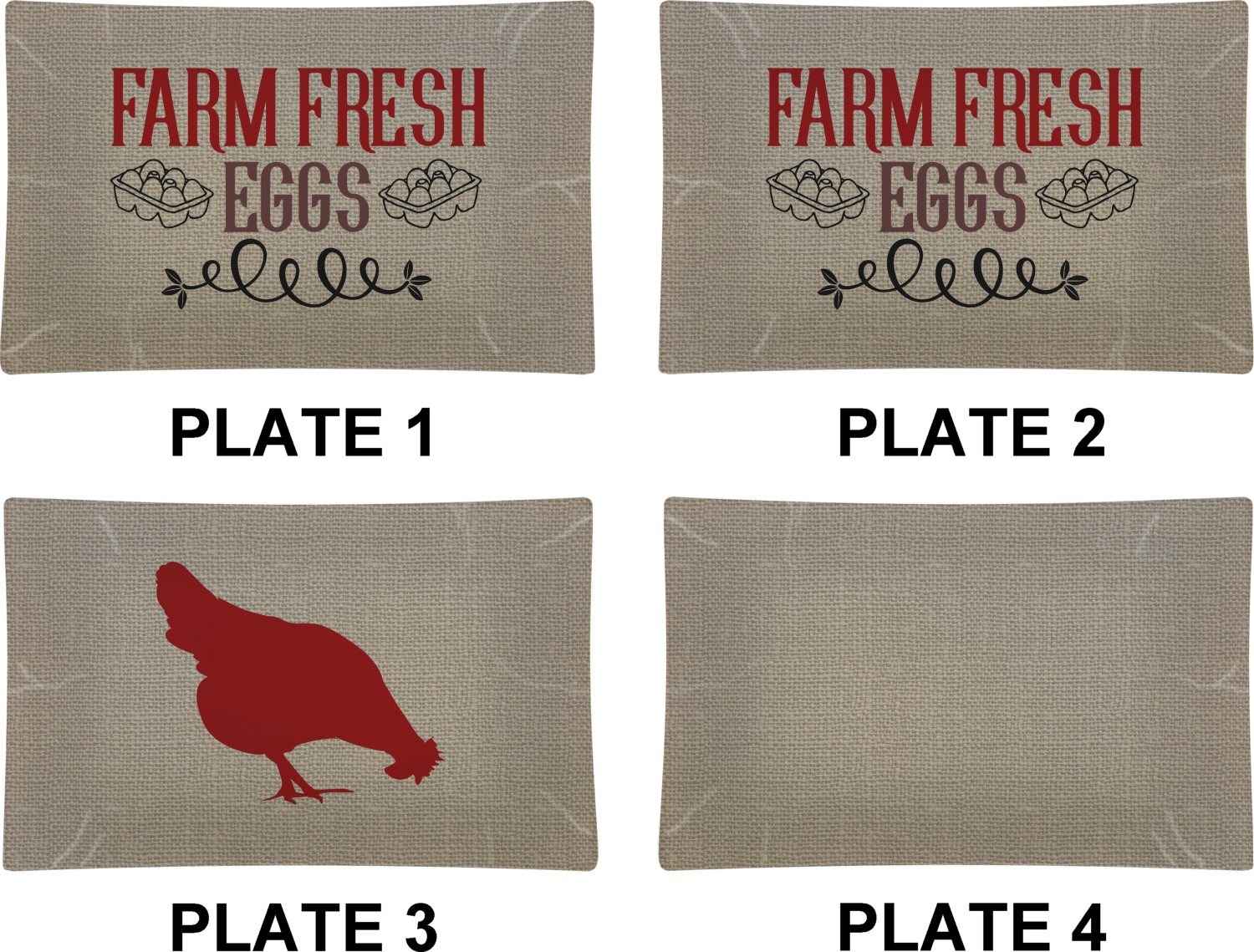 This design uses the quote "farm fresh eggs" with two crates of eggs pictured on either side and a beautiful scrolling design below. The quote has a bright and dark red, both which stand out beautifully against the burlap textured background. This quote and a chicken graphic are used throughout the design.