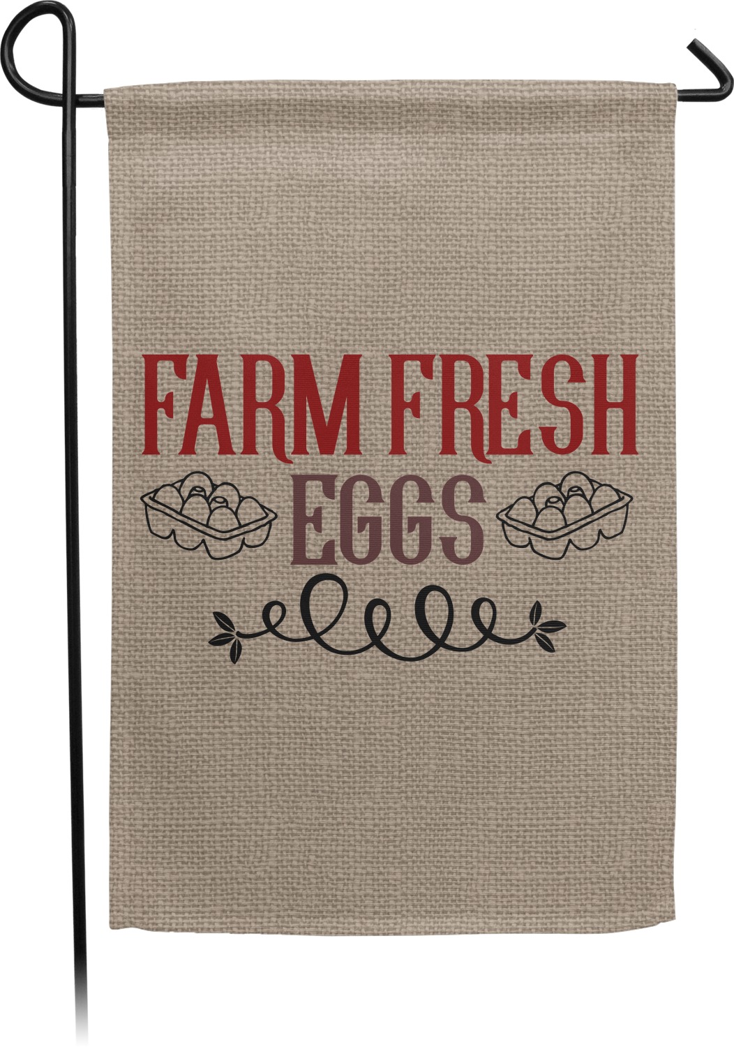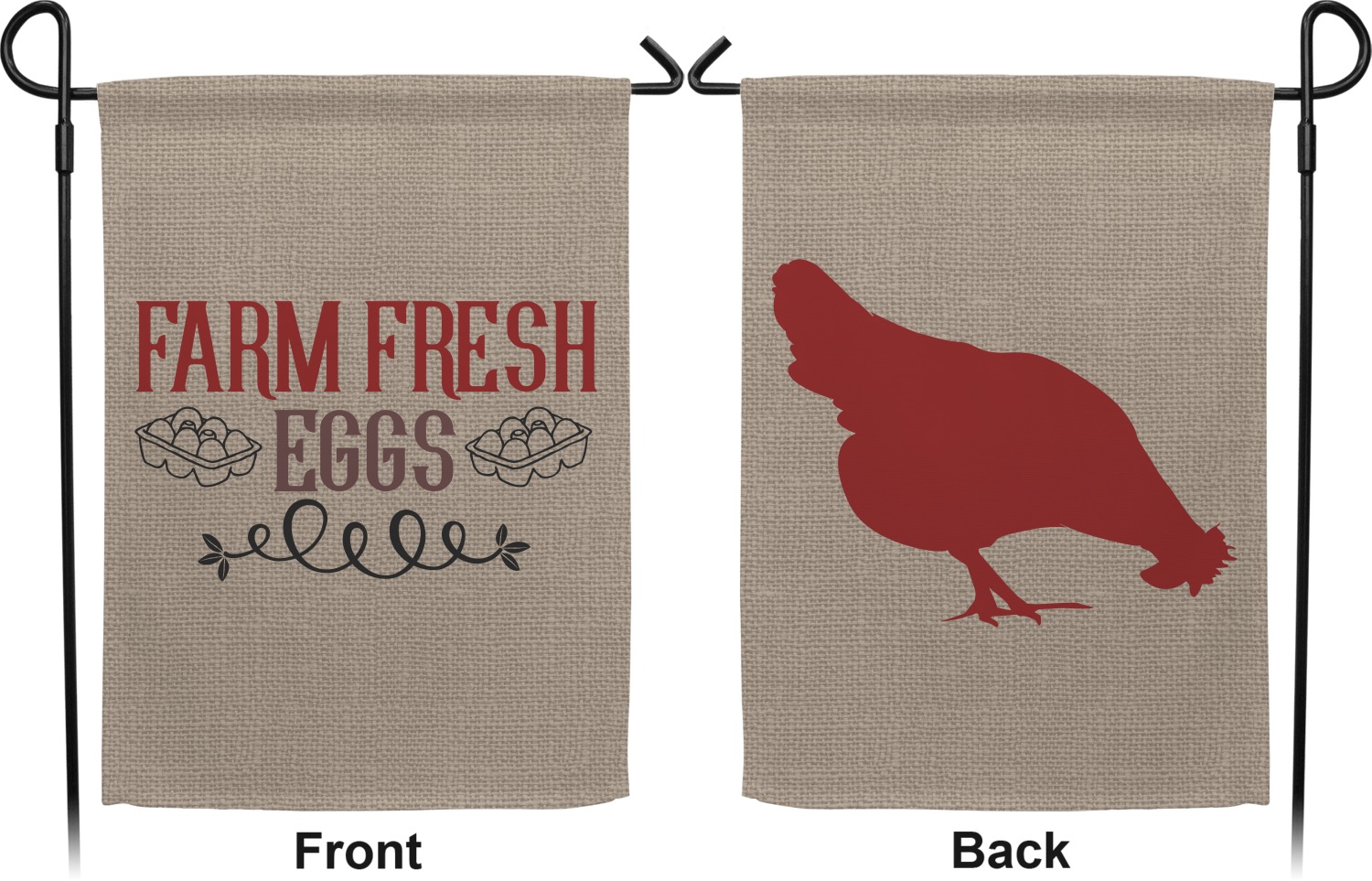 This design uses the quote "farm fresh eggs" with two crates of eggs pictured on either side and a beautiful scrolling design below. The quote has a bright and dark red, both which stand out beautifully against the burlap textured background. This quote and a chicken graphic are used throughout the design.