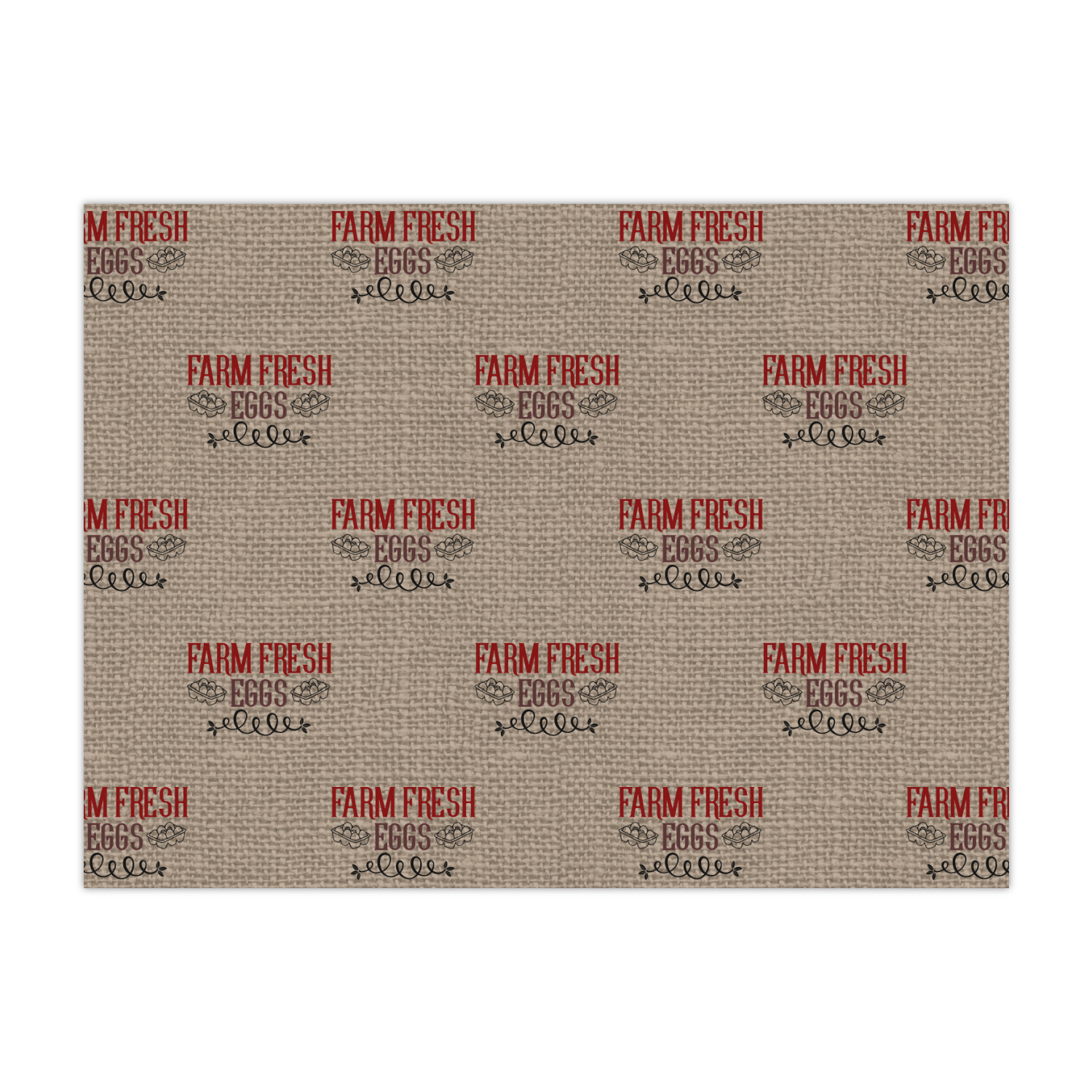 This design uses the quote "farm fresh eggs" with two crates of eggs pictured on either side and a beautiful scrolling design below. The quote has a bright and dark red, both which stand out beautifully against the burlap textured background. This quote and a chicken graphic are used throughout the design.