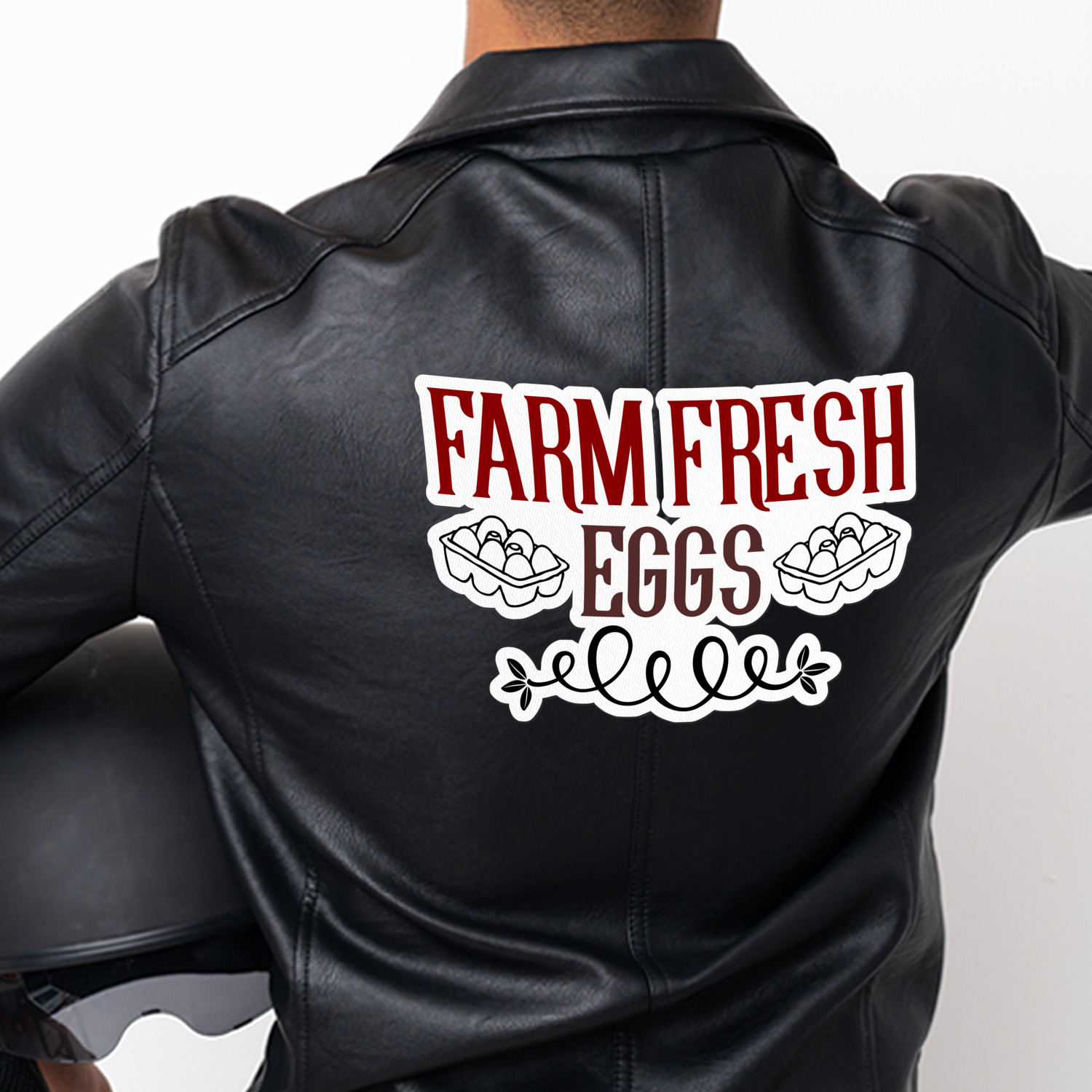 This design uses the quote "farm fresh eggs" with two crates of eggs pictured on either side and a beautiful scrolling design below. The quote has a bright and dark red, both which stand out beautifully against the burlap textured background. This quote and a chicken graphic are used throughout the design.