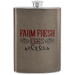 This design uses the quote "farm fresh eggs" with two crates of eggs pictured on either side and a beautiful scrolling design below. The quote has a bright and dark red, both which stand out beautifully against the burlap textured background. This quote and a chicken graphic are used throughout the design.