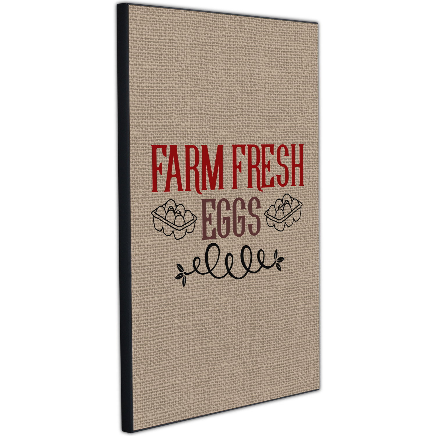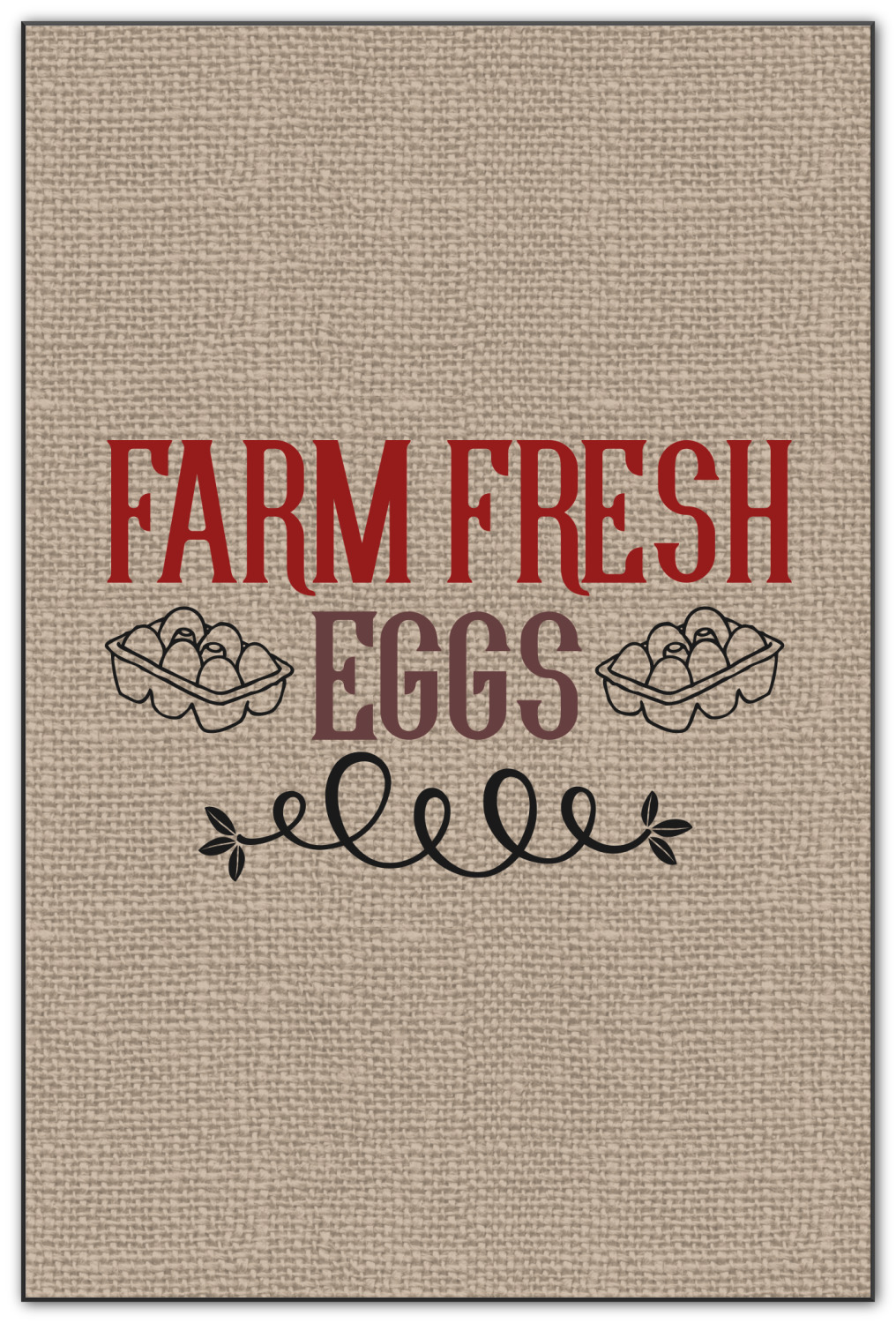This design uses the quote "farm fresh eggs" with two crates of eggs pictured on either side and a beautiful scrolling design below. The quote has a bright and dark red, both which stand out beautifully against the burlap textured background. This quote and a chicken graphic are used throughout the design.