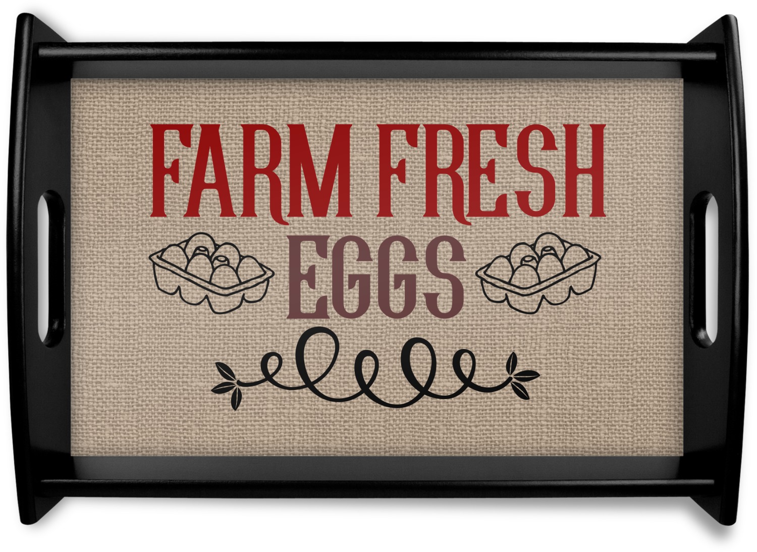 This serving tray with handles features square edges and two rounded sides, creating a very modern look. Each side is fabricated from a beautifully cut, natural wood. The bottom of the interior of the tray displays your customized design in bright, vibrant color. The tray is sold in both a black color and a natural wood look. Each variation of the wood serving tray has two sizes: Small, which is 14" x 10" x 2.25", and Large, which is 19.5" x 13.5" x 2.75".