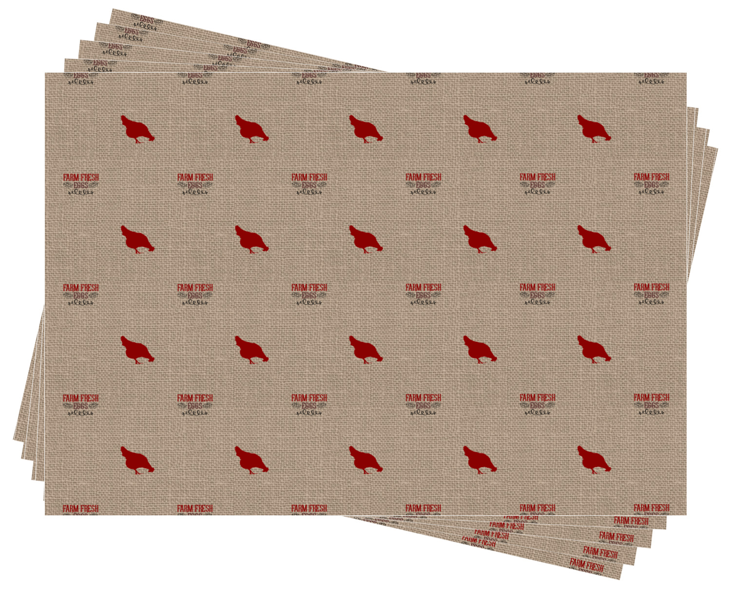 This design uses the quote "farm fresh eggs" with two crates of eggs pictured on either side and a beautiful scrolling design below. The quote has a bright and dark red, both which stand out beautifully against the burlap textured background. This quote and a chicken graphic are used throughout the design.