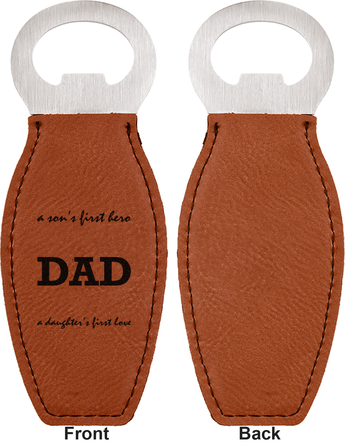Built from stainless steel, these custom bottle openers are wrapped in a cognac-colored leatherette. Sharp, black stitching lines the edges for extra durability and a finished touch. Your personalization is laser-engraved onto the surface of this leatherette, leaving behind a crisp, black coloration. At 4.6 by 1.8 inches, this beer bottle opener gives you much of leverage when trying to open a stubborn bottle. On the opposite end of the opener, you'll find a magnet that you can use to display your new, unique bottle opener!