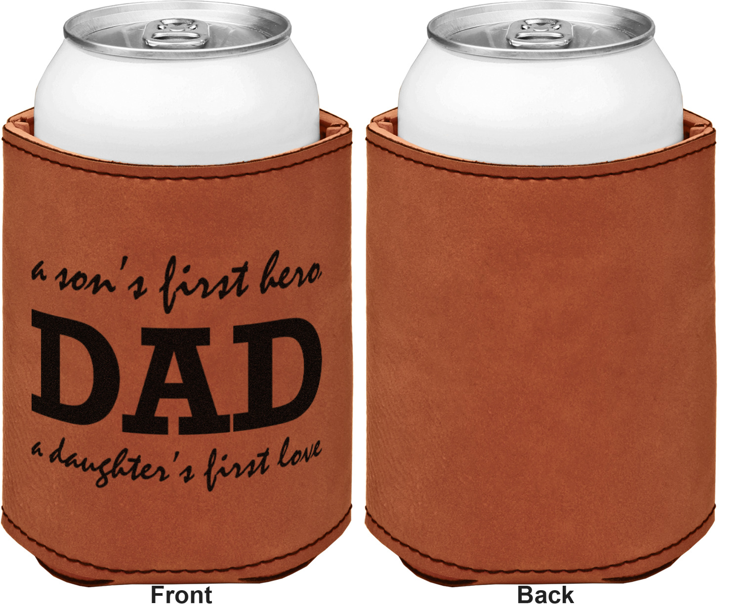This can sleeve is made from a cognac-brown leatherette and stitched with a sturdy, black thread. A slim padding lines the inside of your can sleeve to allow for a better fit once your drink is inserted. The sleeve itself measures at 4 by 4.5 inches, allowing this custom can sleeve to accommodate most canned drinks. Your personalized design can be engraved on the front and back, or solely the front. When laser-engraved, your design appears as a black coloration which contrasts the leatherette nicely.