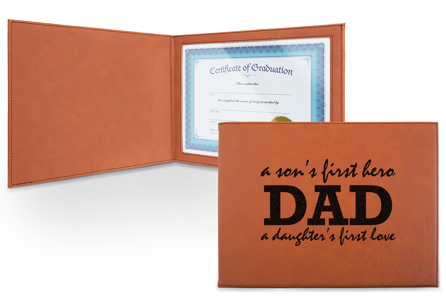 This cognac-colored, leatherette certificate jacket is the ideal way to display or store your hard-earned certificate. When closed, the custom certificate holder measures at 12 by 9 inches. The interior of the certificate cover includes a clear, vinyl window to encase your diploma. The window measures at around 10.5 by 7.5 inches and can accommodate a diploma that measures at up to 8.5 by 11 inches. You can either choose to have your customization laser engraved on the front and interior, or solely the front.