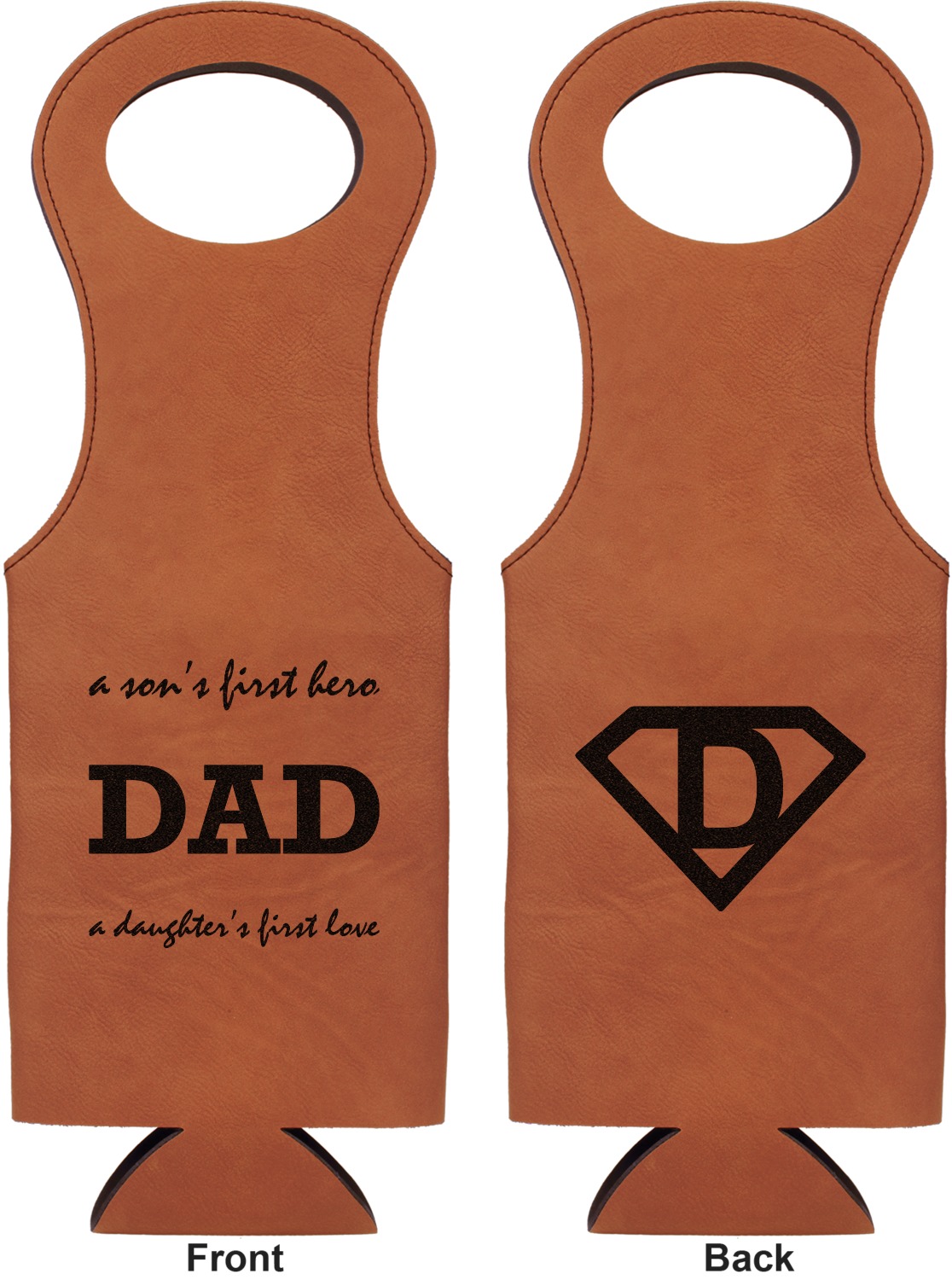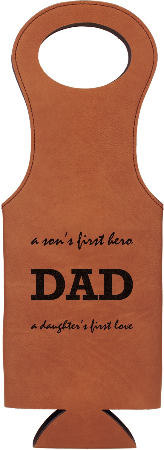 This wine carrier is made from a stunning leatherette, in a cognac-brown color. Strong, black stitching lines the sides of your wine bottle bag and provides extra durability. The interior is lined with a padded, black material to allow for a snug fit once your bottle is placed inside. At the top of this wine gift bag, you'll find two oval shaped handles that elegantly complements the rest of the bag's style. We provide you with the option of laser-engraving the front, or the front and back of your new personalized wine bag!