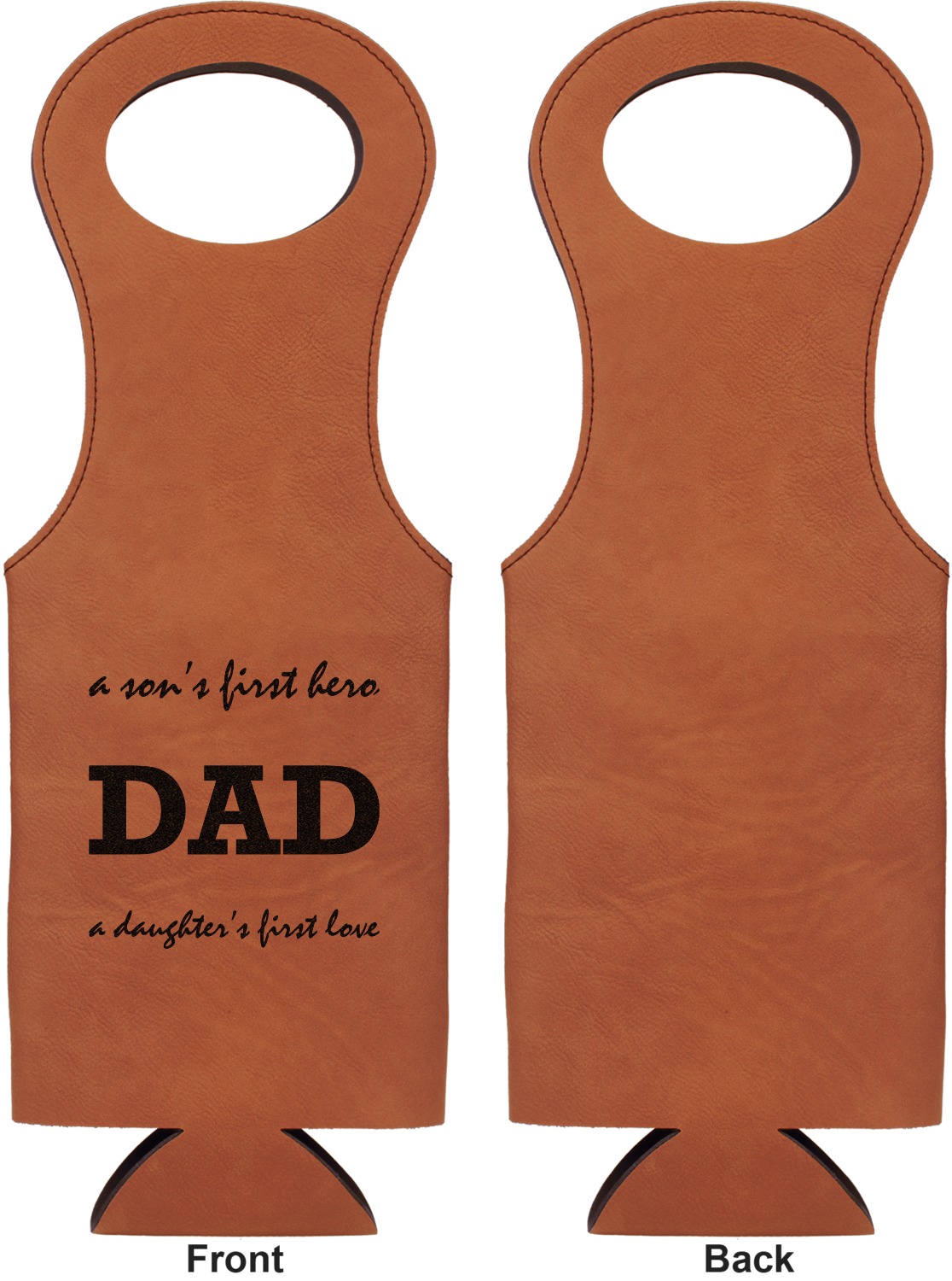 This wine carrier is made from a stunning leatherette, in a cognac-brown color. Strong, black stitching lines the sides of your wine bottle bag and provides extra durability. The interior is lined with a padded, black material to allow for a snug fit once your bottle is placed inside. At the top of this wine gift bag, you'll find two oval shaped handles that elegantly complements the rest of the bag's style. We provide you with the option of laser-engraving the front, or the front and back of your new personalized wine bag!
