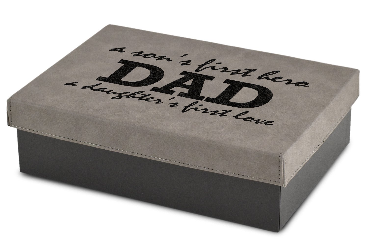 These gift boxes are available in 3 different sizes to accommodate various sized gifts. Available in gray as a neutral color for any occasion as well as to showcase your design boldly. Engraved with a laser this high quality paper board and faux leather gift box is unique and makes any gift stand out.