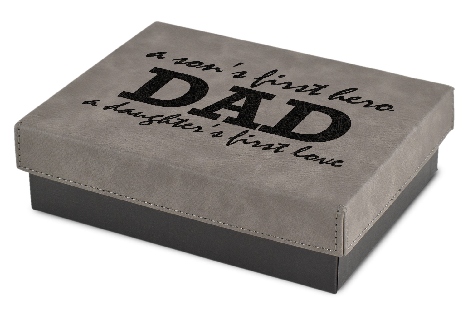 These gift boxes are available in 3 different sizes to accommodate various sized gifts. Available in gray as a neutral color for any occasion as well as to showcase your design boldly. Engraved with a laser this high quality paper board and faux leather gift box is unique and makes any gift stand out.