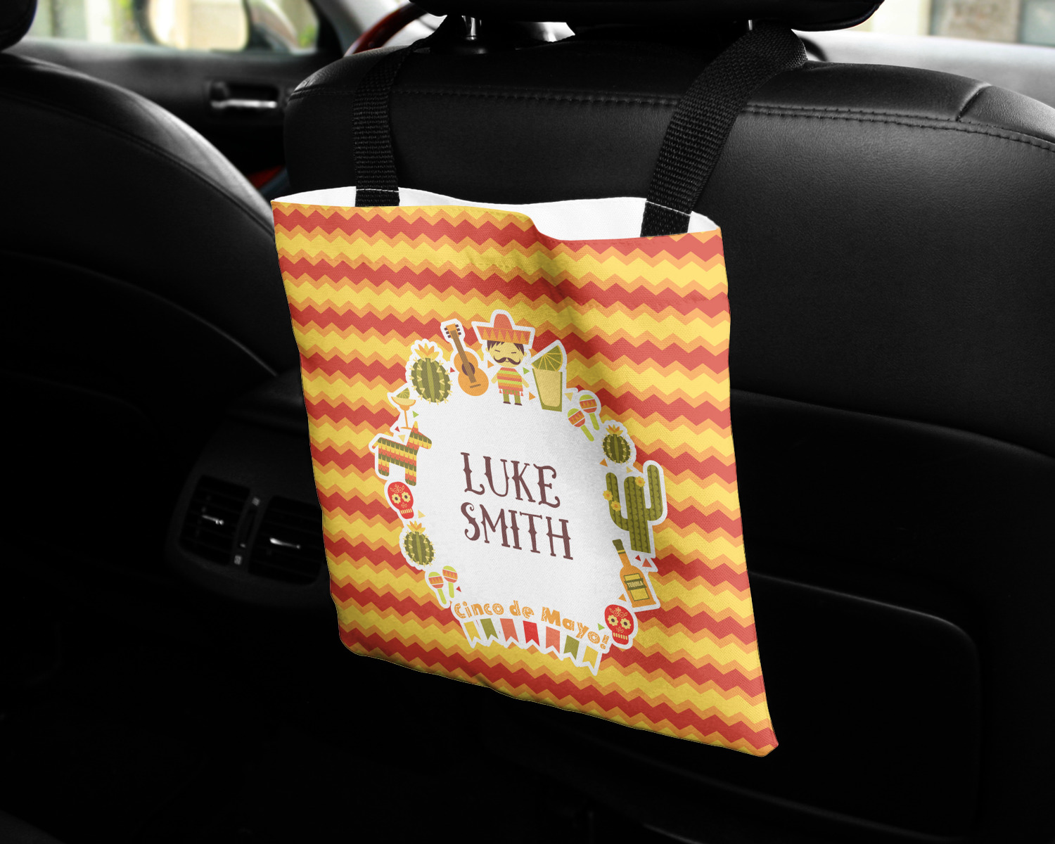 These car back seat organizers are sturdy tote-like bags, fabricated from a robust polyester, and features a single handle on the back side. The strap features an attachable velcro for easy attachment to headrests, grocery carts, car seats, and more. Simply undo the velcro, loop the strap around the headrest, reattach the velcro, and let the organizer hang from the front seat. These car organizers are the perfect means of increasing your backseat's legroom, while storing multiple items in one place for better accessibility. Each car back seat organizer measures at 10 by 10 inches, and features your personalized design printed across its front and back.