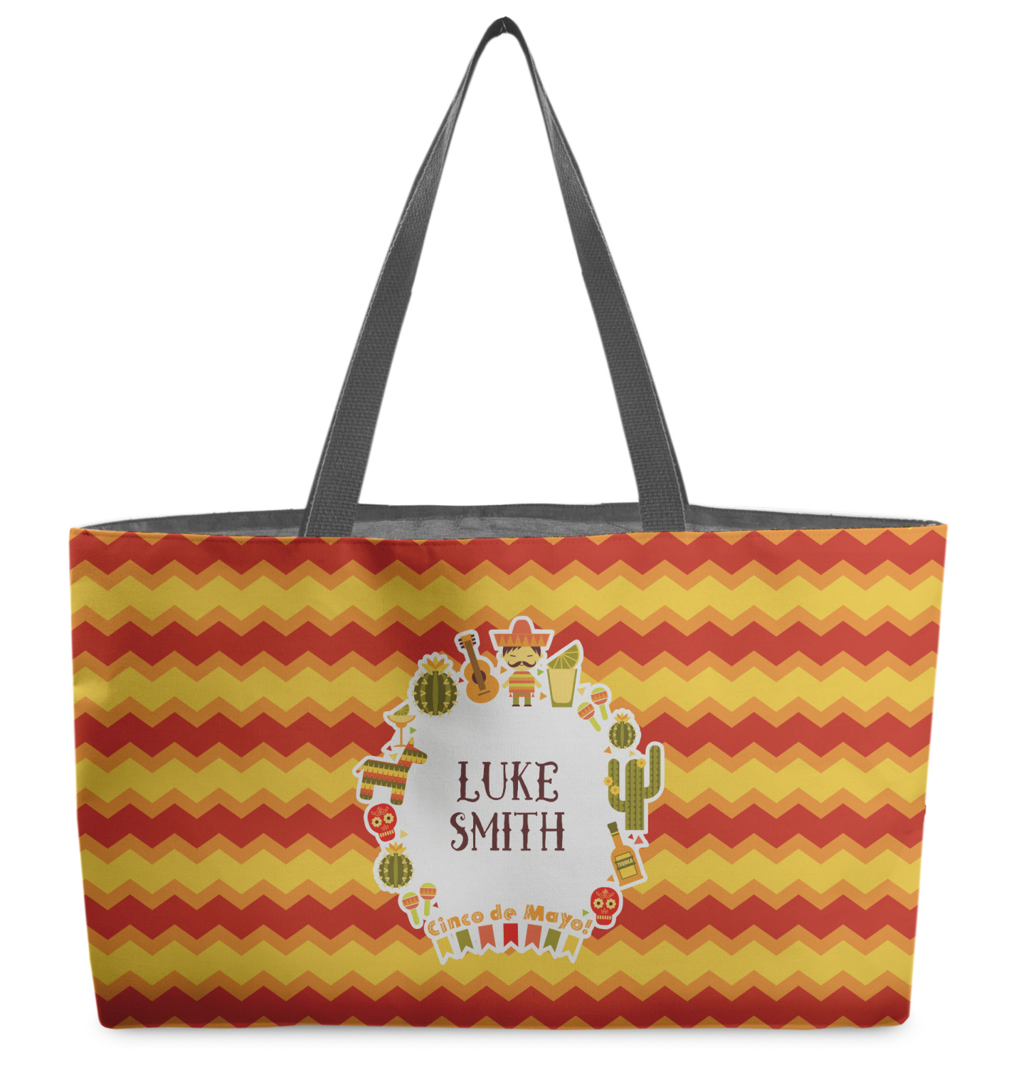 These beach totes are handmade here in the USA. Fabric is printed with your design. The tote is then sewn from the fabric pieces, lining and handles added.