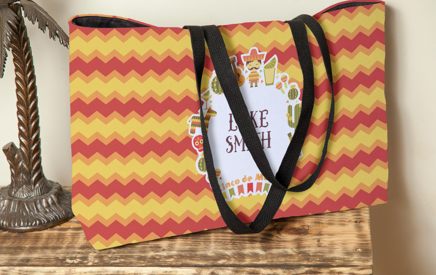 This design has many bright colors including red, orange, yellow, and green. The fun chevron gives a great pop to the fun frame that sits in the foreground. The frame has all kinds of fun illustrations like maracas, cacti, and even a mariachi man! The coordinating pattern has fun triangles all over with the phrase "Let's Fiesta!" all over as well. This really is the perfect design to get people hyped.