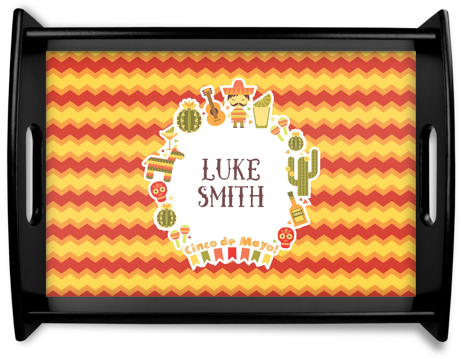 This serving tray with handles features square edges and two rounded sides, creating a very modern look. Each side is fabricated from a beautifully cut, natural wood. The bottom of the interior of the tray displays your customized design in bright, vibrant color. The tray is sold in both a black color and a natural wood look. Each variation of the wood serving tray has two sizes: Small, which is 14" x 10" x 2.25", and Large, which is 19.5" x 13.5" x 2.75".