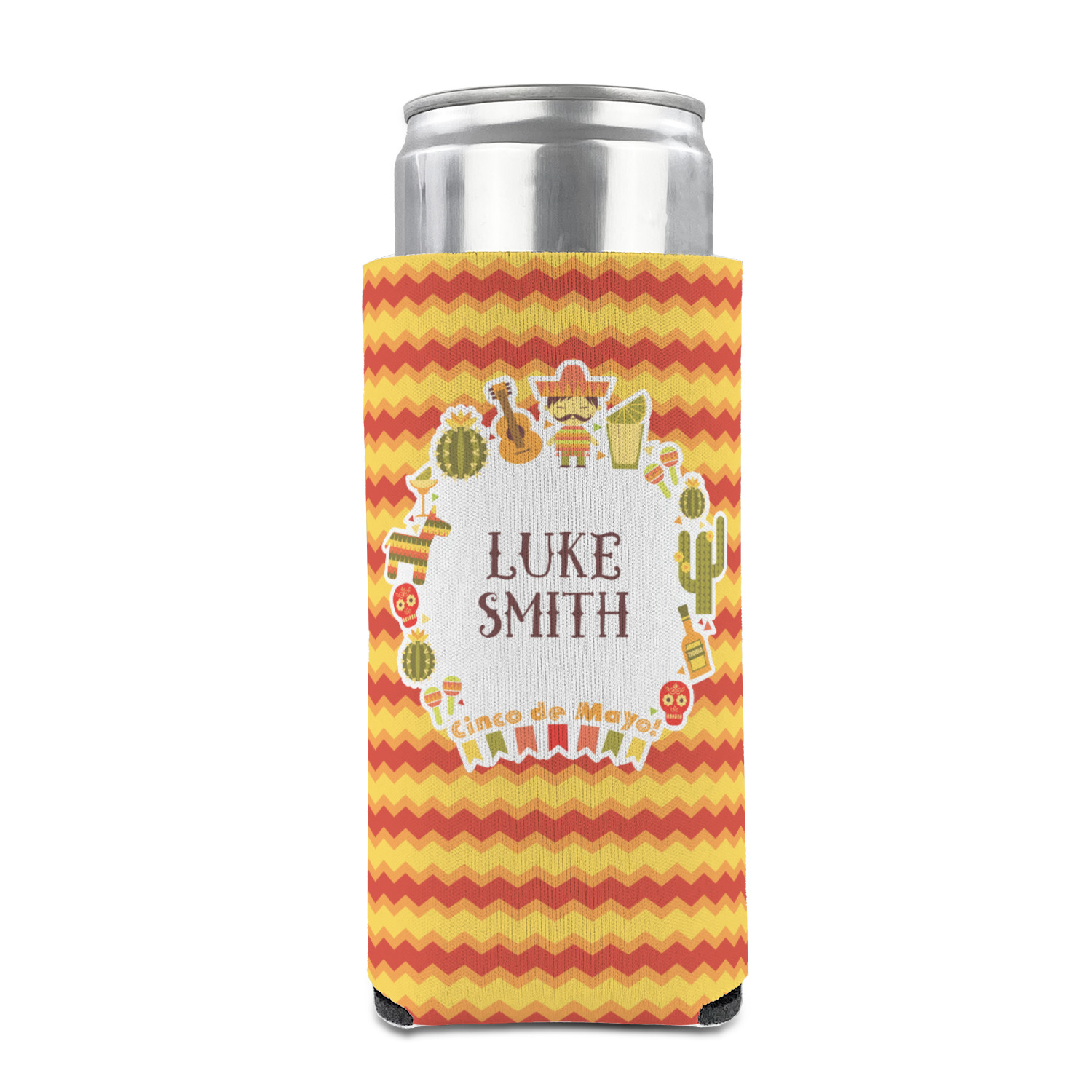 This design has many bright colors including red, orange, yellow, and green. The fun chevron gives a great pop to the fun frame that sits in the foreground. The frame has all kinds of fun illustrations like maracas, cacti, and even a mariachi man! The coordinating pattern has fun triangles all over with the phrase "Let's Fiesta!" all over as well. This really is the perfect design to get people hyped.