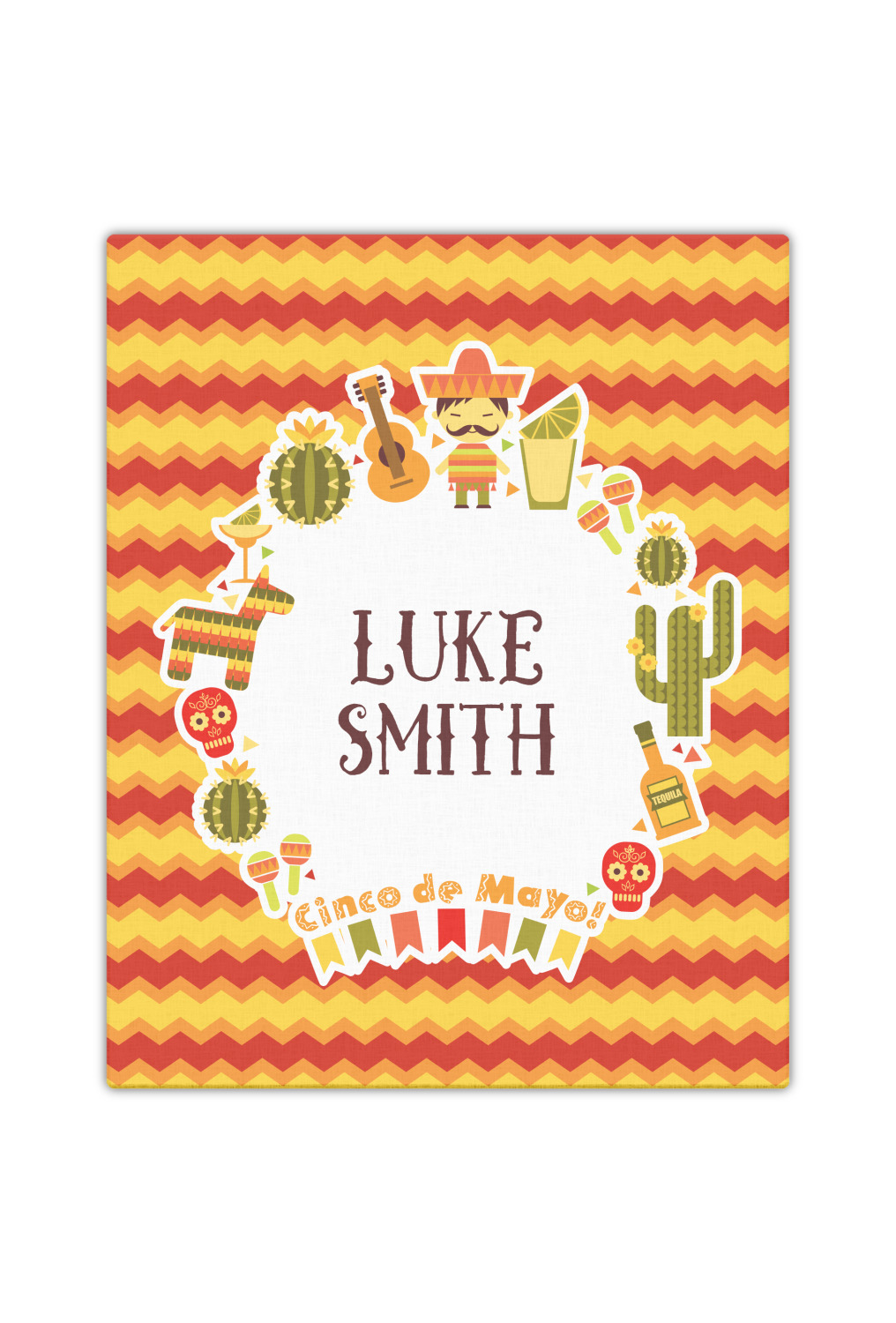 This design has many bright colors including red, orange, yellow, and green. The fun chevron gives a great pop to the fun frame that sits in the foreground. The frame has all kinds of fun illustrations like maracas, cacti, and even a mariachi man! The coordinating pattern has fun triangles all over with the phrase "Let's Fiesta!" all over as well. This really is the perfect design to get people hyped.