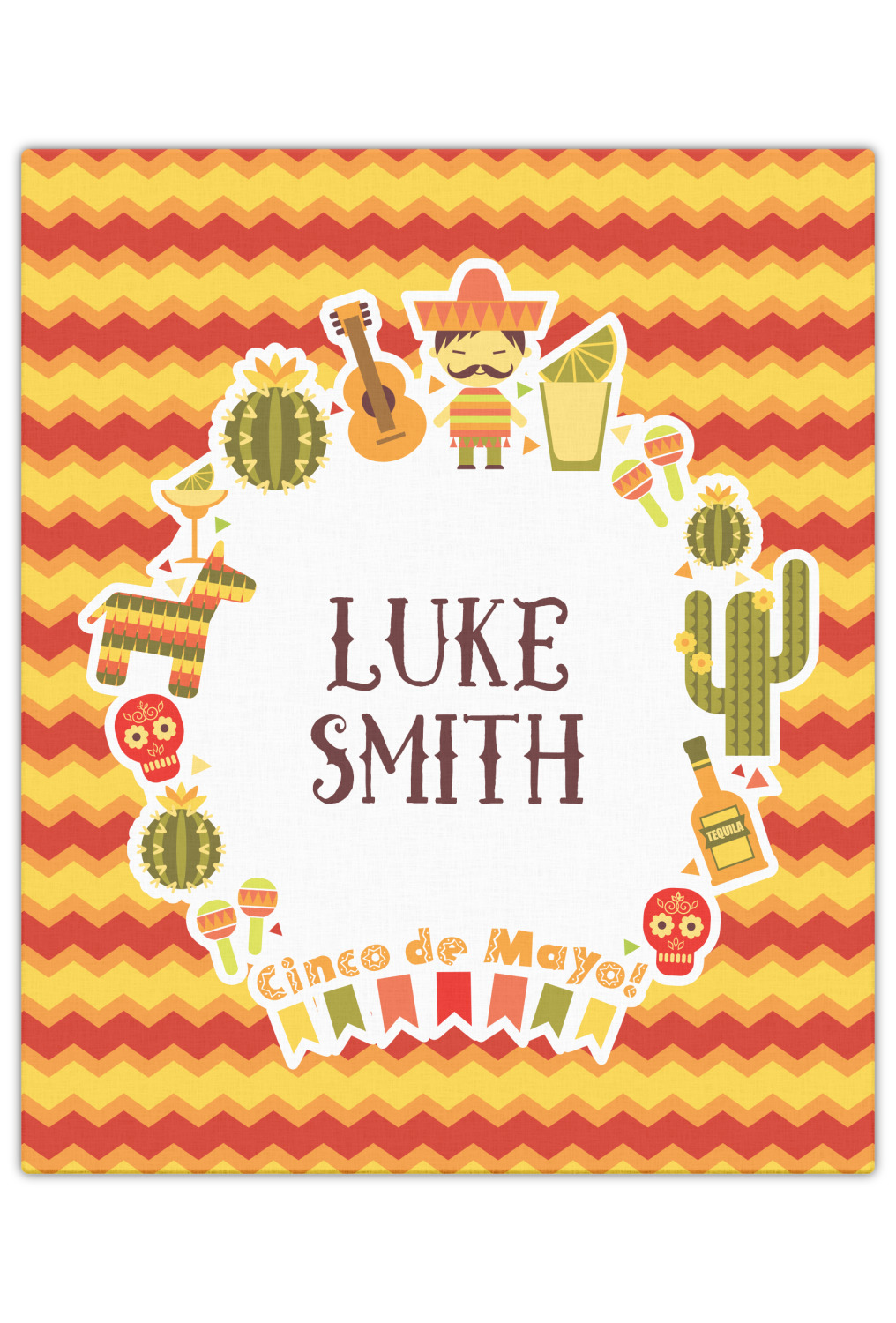 This design has many bright colors including red, orange, yellow, and green. The fun chevron gives a great pop to the fun frame that sits in the foreground. The frame has all kinds of fun illustrations like maracas, cacti, and even a mariachi man! The coordinating pattern has fun triangles all over with the phrase "Let's Fiesta!" all over as well. This really is the perfect design to get people hyped.
