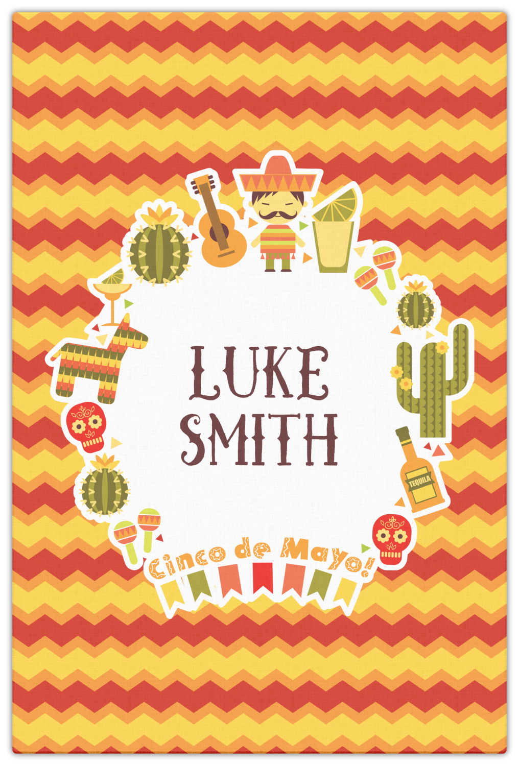 This design has many bright colors including red, orange, yellow, and green. The fun chevron gives a great pop to the fun frame that sits in the foreground. The frame has all kinds of fun illustrations like maracas, cacti, and even a mariachi man! The coordinating pattern has fun triangles all over with the phrase "Let's Fiesta!" all over as well. This really is the perfect design to get people hyped.